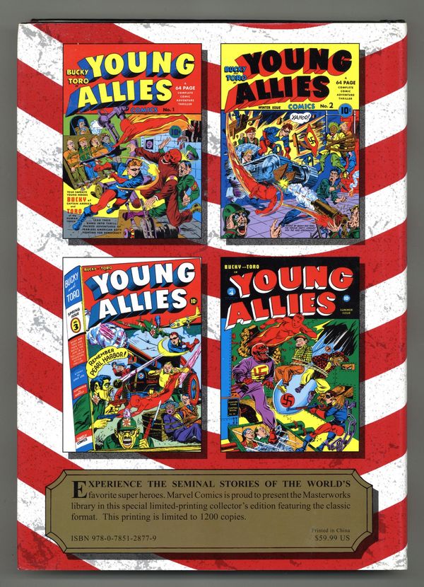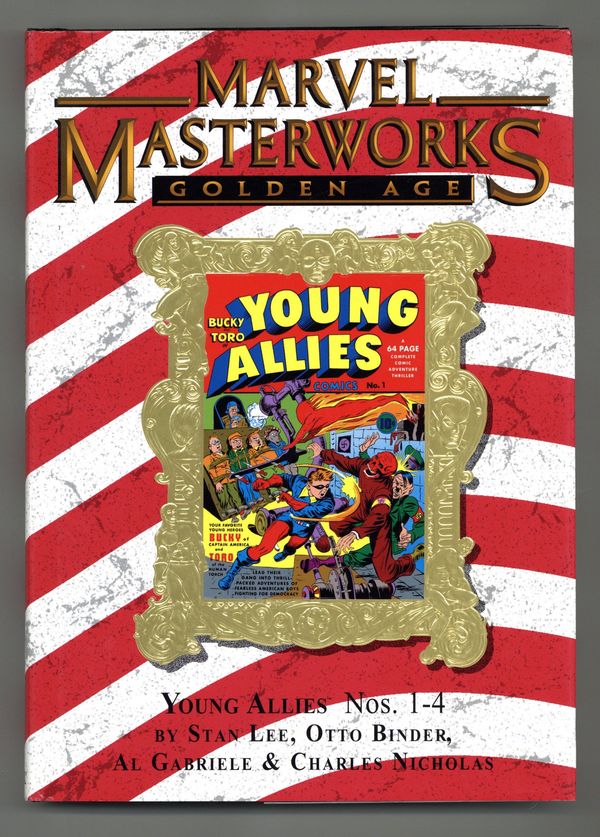Volume 121 - 1st printing. "Golden Age: The Young Allies!" Collects Young Allies Comics (1941-1946) #1-4. Written by STAN LEE and OTTO BINDER. Art by AL GABRIELE, JACK KIRBY, CHARLES NICHOLASWOTJKOSWKI, and JACK ALDERMAN. Cover by JACK KIRBY. The Young Allies, comics' very first boy-adventure team, leap into four-color action once more with their debut MARVEL MASTERWORKS volume! Super-hero sidekicks unite when Captain America's pal, Bucky and his Sentinels of Liberty team up with the Human Torch's protégé, Toro, and take on the Axis! And they won't waste a second getting down to business. Right from issue #1 they take the fight straight to Berlin and, rest assured, the Red Skull, and even Hitler himself, won't be walking out of this one without a bloody nose. Next up, the Black Talon returns from the pages of CAPTAIN AMERICA COMICS to terrorize the Young Allies, or maybe that should be the other way around? There are 5th Columnists, Nazis, Imperial generals, spies, and action galore in each of these Timely classics. The Golden Age of Comics packed in cover-to-cover adventure, but there are few that can compare to the massive, 60-pages plus, issue-length adventures of the Young Allies! Hardcover, 280 pages, full color. Cover price $59.99.