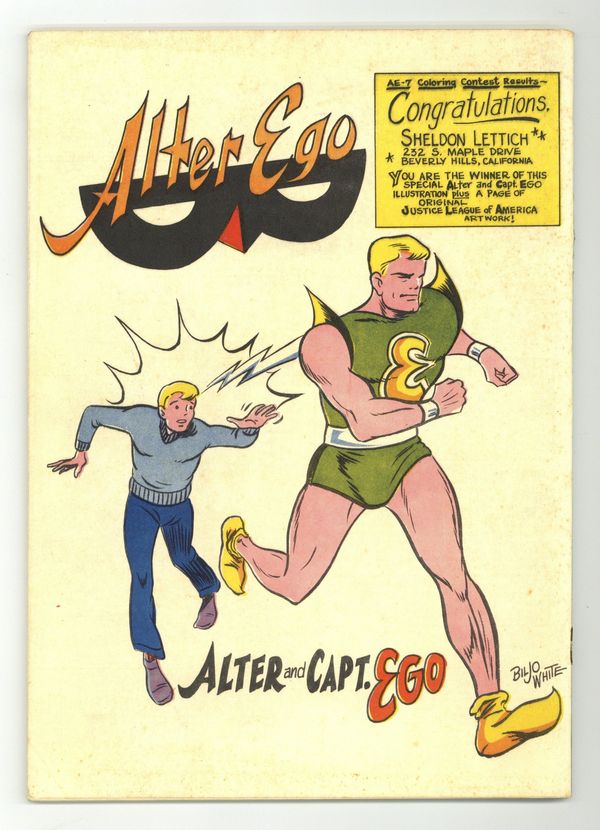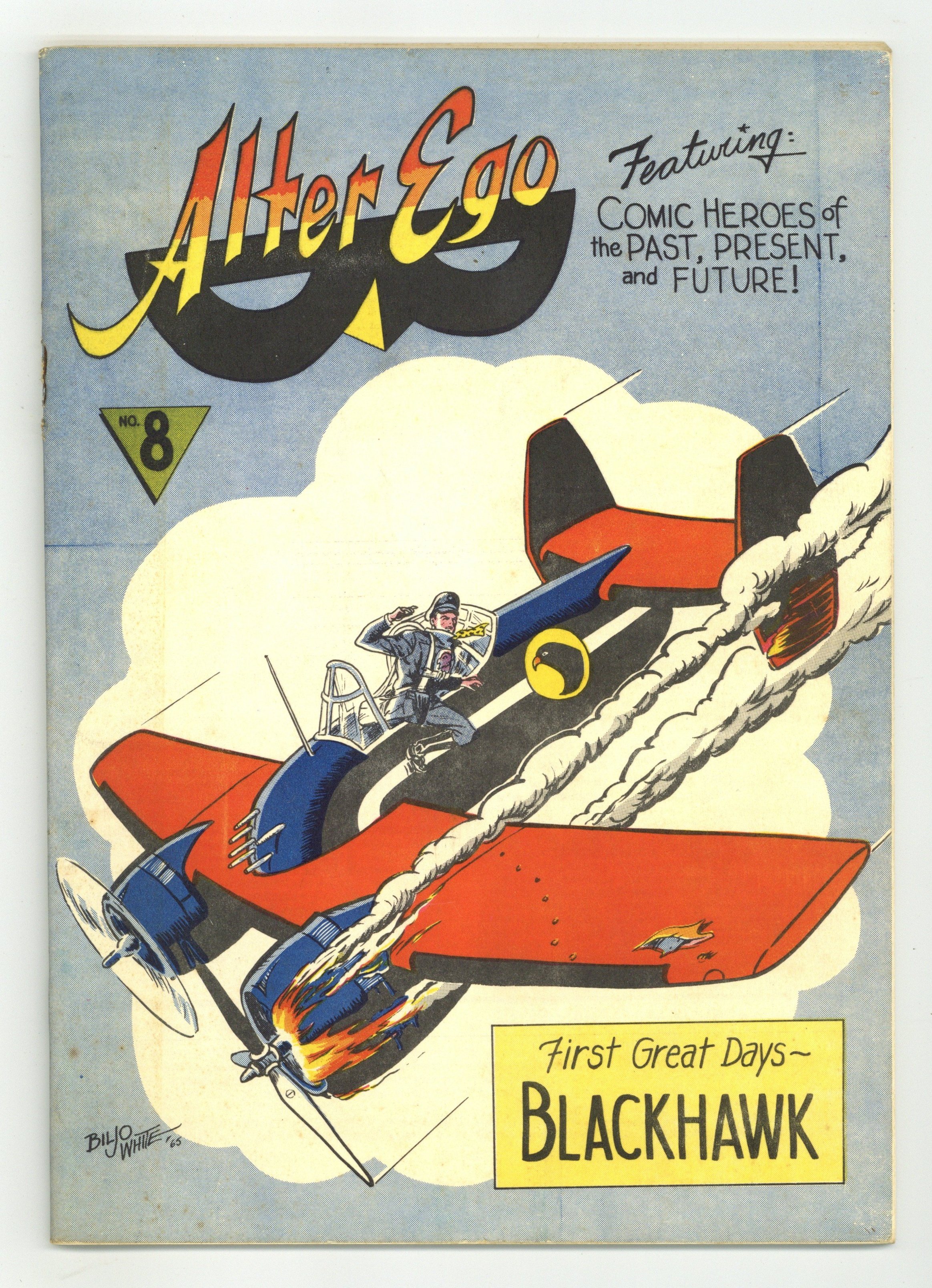 Alter Ego was billed as "the world's first comic book fanzine." Issue #8 includes the following: an editorial by Roy Thomas; The Bestest League art by Thomas; a piece on Blackhawk by Derrill Rothermich and Thomas (with art by Biljo White); a feature on Doc Savage by Robert M. Hopkins (with art by Hopkins and White); "The Eclipse: The Mystery of Malimoor!" nine-page strip by Drury Moroz (script) and Ronn Foss (art); an ad for Batmania #4; part one of an article on Mexican super-heroes by Fred Patten; "Two Cases of Conscience" (Them Justice Guys part two) by Glen Johnson (art by Biljo White); and letters by Mort Weisinger, Wendell Crowley, Otto Binder, Gardner Fox, Phil Seuling, and Kurt Schaffenberger. Blackhawk cover art by Biljo White; Alter and Capt. Ego back cover art by White. Edited by Roy Thomas. 40 pgs. Winter, 1964-65.