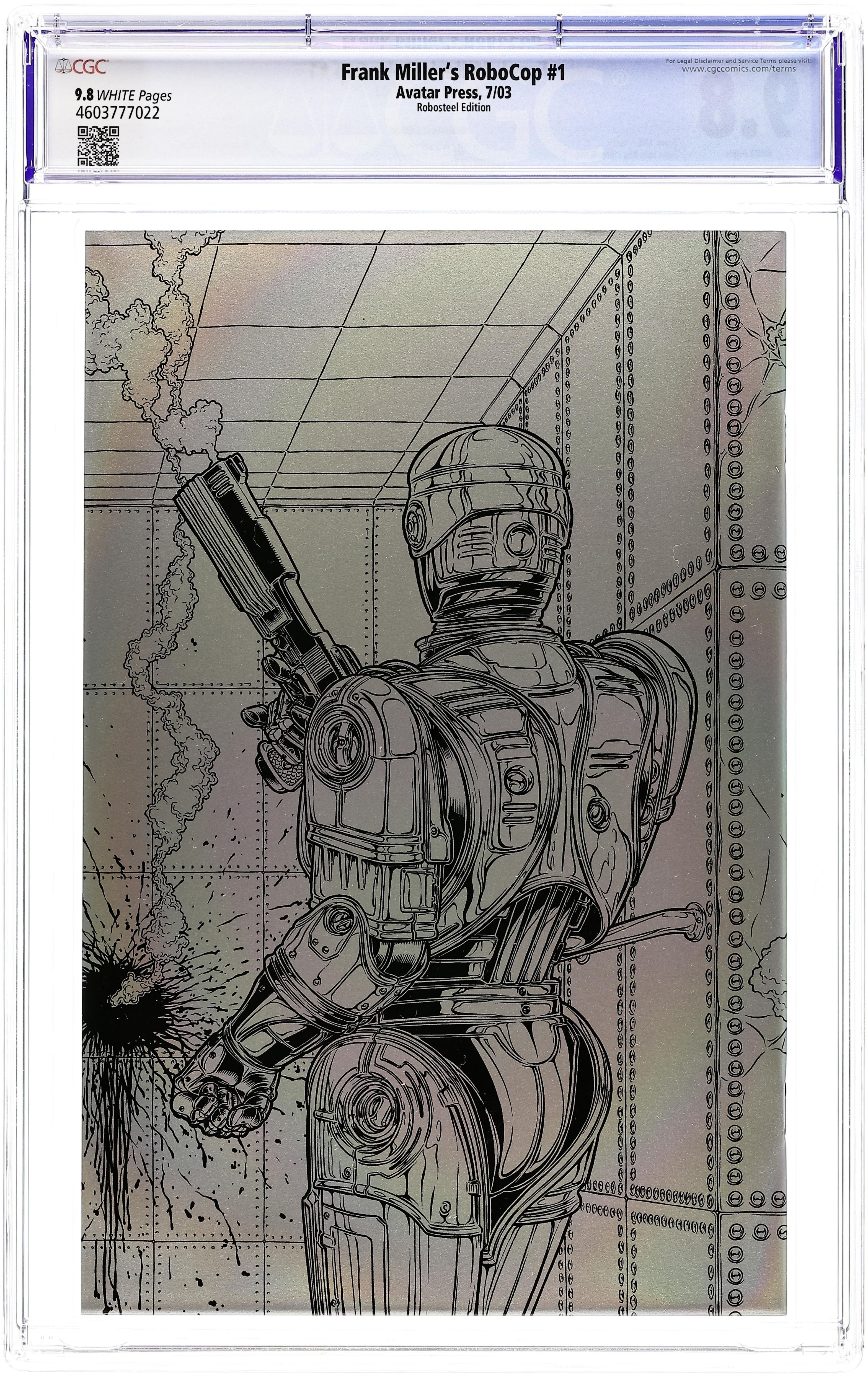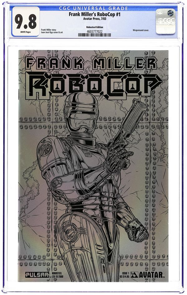 Robosteel cover (wraparound). Limited to 2000 copies. by Frank Miller & Juan Jose Ryp At long last, Frank Miller's never-before-seen full Robocop epic finally sees light of day! Robocop was one of the truly great bits of movie and pop culture magic from the 80s, and the cult of Robocop continues to grow strong to this day. In full-on action, the Robocop is told as Frank Miller always intended, composed straight from the master's original writings and scripts! The vast majority of Miller's insane ideas, vicious black humor, and robotic mayhem never made it to the screen, but every last bit is finally unleashed in this series. With sequential adaptation from Steven Grant and art by superstar Juan Jose Ryp, the series features covers by Frank Miller, who is also personally signing the creation of the entire project. Cover price $14.95.