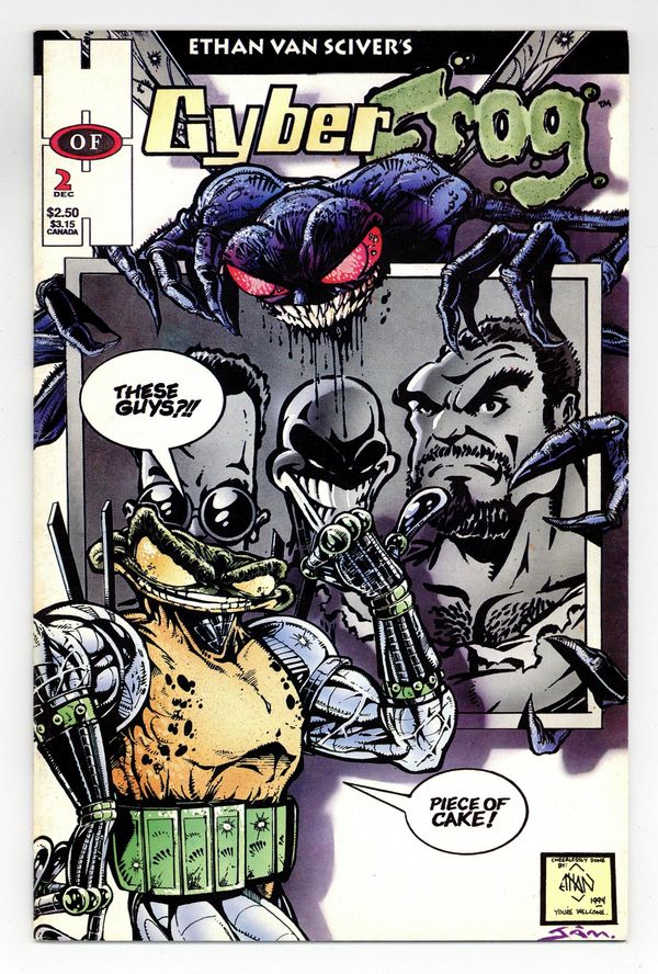 Stories and art by Ethan Van Sciver, Matt Martin, and C.J. Robbins. Cover by Ethan Van Sciver. Early work by future superstar artist Van Sciver. In the tradition of certain other warrior amphibians of the comics comes Cyberfrog, a cold-blooded cyber-croaker with a yen for unleashing violence against random bad guys. Several Cyberfrog stories by different creators, including a crossover with Deadbolt, in that characters final appearance. C'mon, Anaconda; All Apologies; Shameless Self-Promotion. 32 pages, B&W. Mature readers. Cover price $2.50.