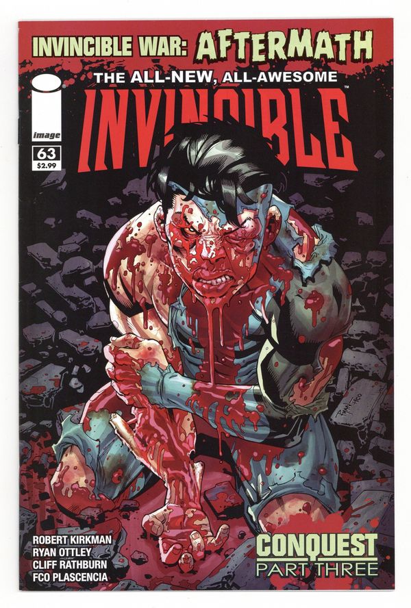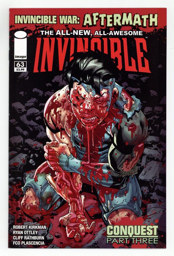 Written by ROBERT KIRKMAN. Art and Cover by RYAN OTTLEY and FCO PLASCENCIA. INVINCIBLE WAR: AFTERMATH! CONQUEST IS HERE! The fate of the entire planet rests on Invincible's shoulders... and those shoulders are about to break. 32 pages, full color. Cover price $2.99.