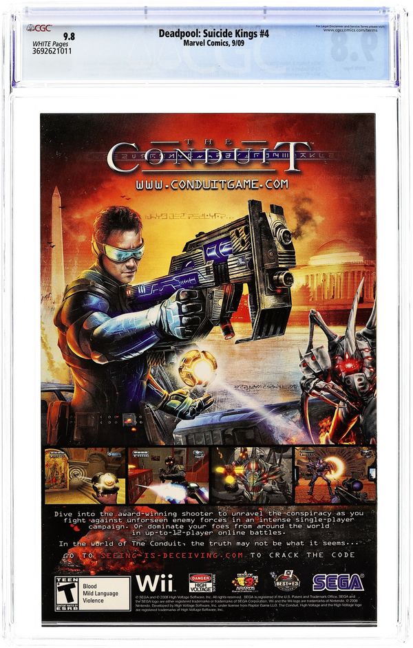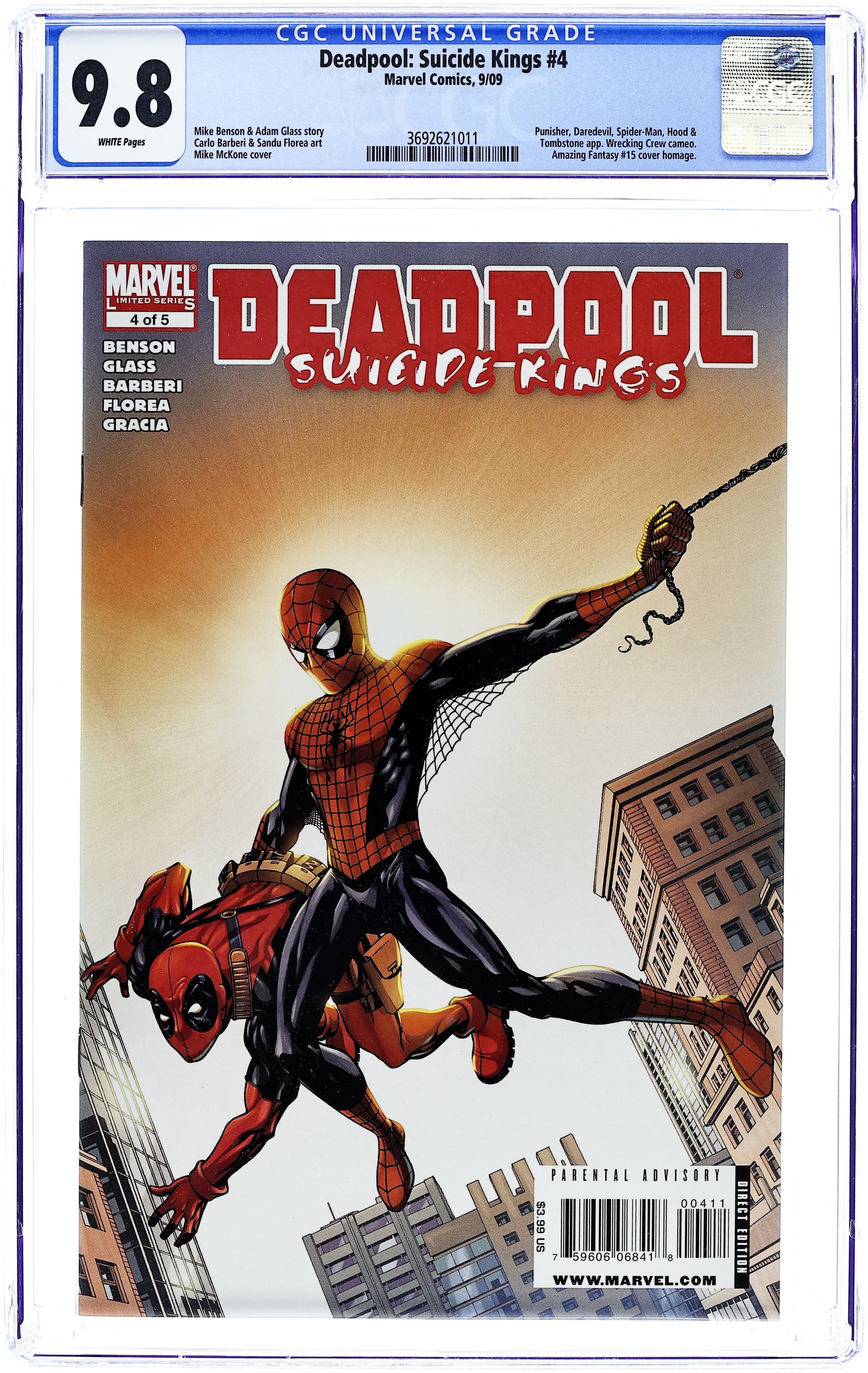 SUICIDE KINGS: PART 4 - DEAD MAN'S HAND. Written by MIKE BENSON and ADAM GLASS. Art by CARLO BARBERI and SANDU FLOREA. Cover by MIKE MCKONE. Deadpool's been framed. No, really! This time, Wade didn't do it! To prove his innocence and find the person responsible, he's got to avoid the Punisher (wants to kill him) and Spider-Man (wants to web him). Luckily for Wade, a certain Man Without Fear believes his story... 32 pages. Cover price $3.99.