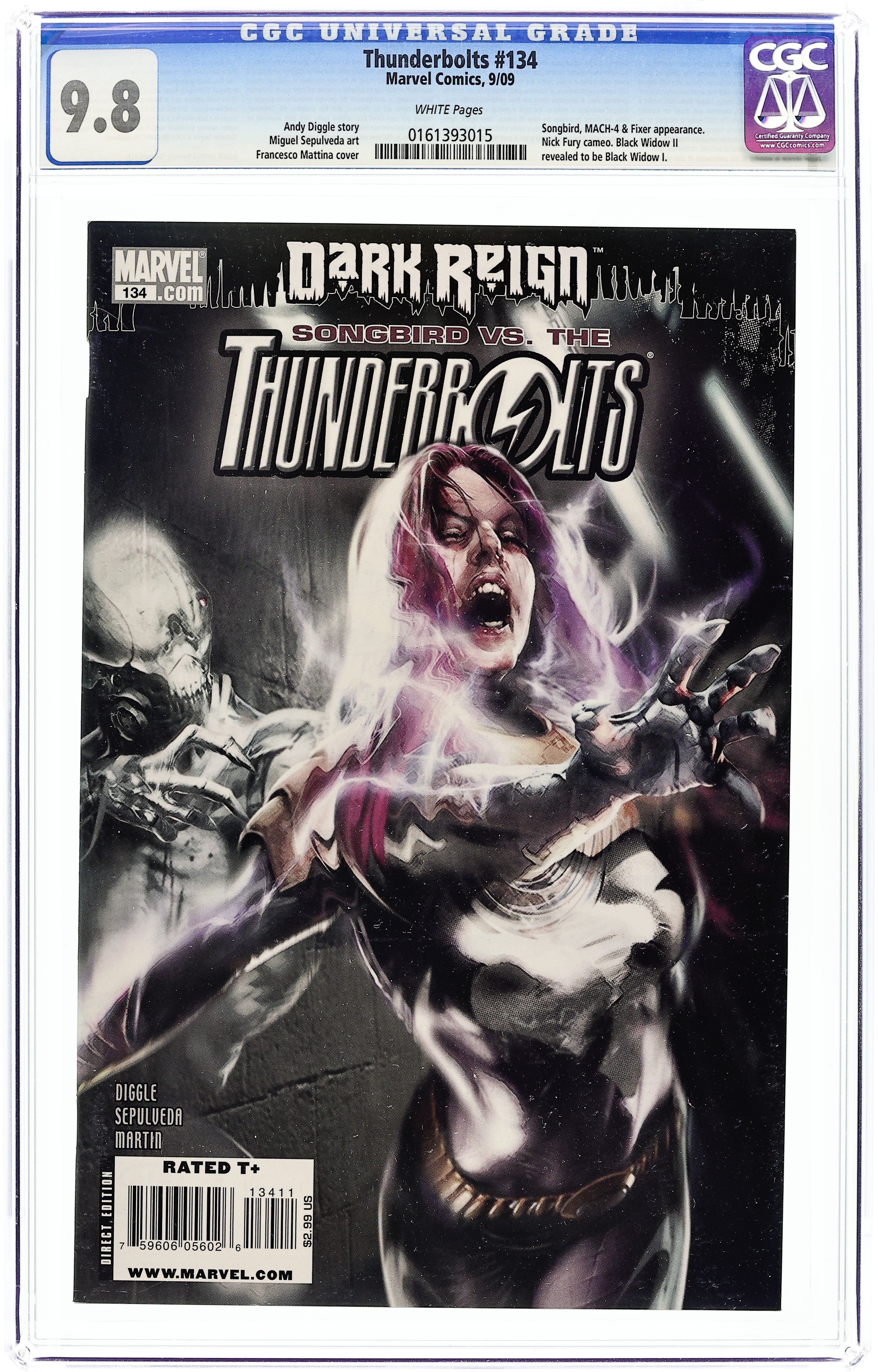 A DARK REIGN TIE-TIN! "Widowmaker": Part 2 of 4 - Written by ANDY DIGGLE. Art by MIGUEL SEPULVEDA. Cover by FRANCESCO 'MATT' MATTINA. It's Thunderbolt vs. Thunderbolt as Black Widow II leads the hunt for renegade ex-team-member Songbird, but one of her own squad of blood-thirsty killers is carrying a deadly secret! Who holds the secret, what is it, and how will it explode the delicate balance of power within Norman Osborn's black-ops hit squad forever? 32 pages, full color. Cover price $2.99.