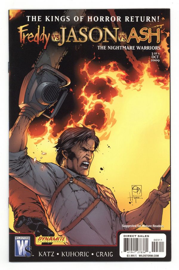 Published Oct 2009 by DC/Wildstorm.$26.00Written by Jeff Katz and James Kuhoric. Art by Jason Craig. Cover by Shane Davis and Sandra Hope. Freddy Krueger has become one with the Necronomicon, and he has the full power of the book at his disposal - including control of the Deadites. Making a Faustian bargain with Jason Voorhees, Freddy promises to return everything he's lost if Jason will be a general in Freddy's army. Will Washington D.C. fall to such nefarious foes? Who could possibly stand against such forces? Ash Williams and Tommy Jarvis aim to find out. 32 pages, full color. MATURE READERS. Cover price $3.99.