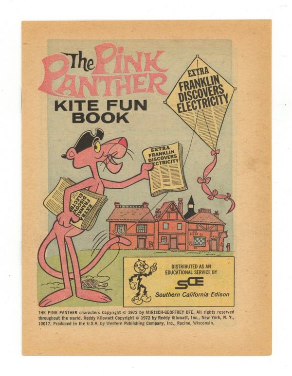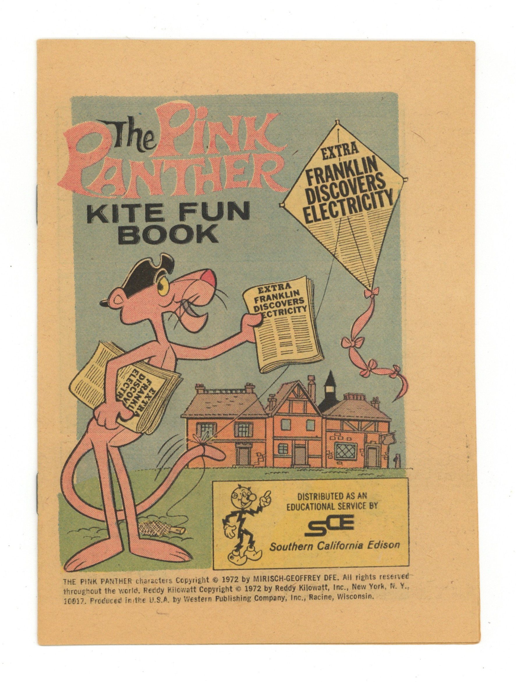 Tags: Kite Fun BookPublished 1972 by Reddy Kilowatt Inc..$24.00The Pink Panther Kite Fun Book (1972) is a promotional comic distributed by Reddy Kilowatt, Inc. via investor-owned utility companies. The Pink Panther joins Reddy Kilowatt in a story about kite safety and fun. The back cover features Reddy's Kite Safety Rules. 16 pages, full color, newsprint, 5-in. x 7-in., no cover price.