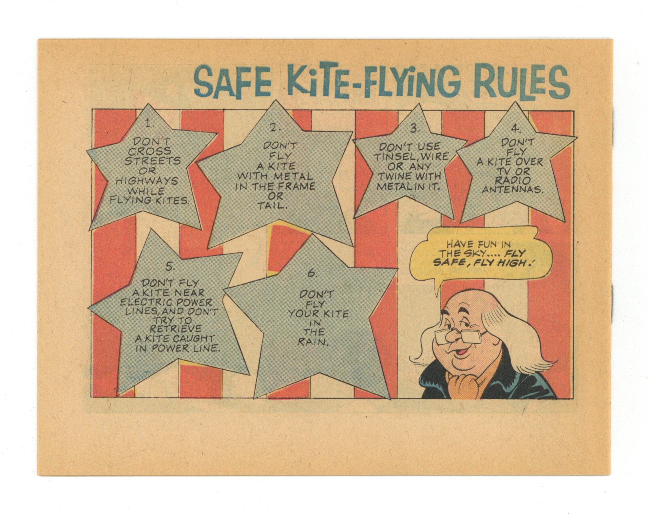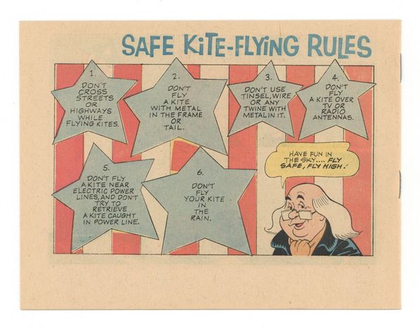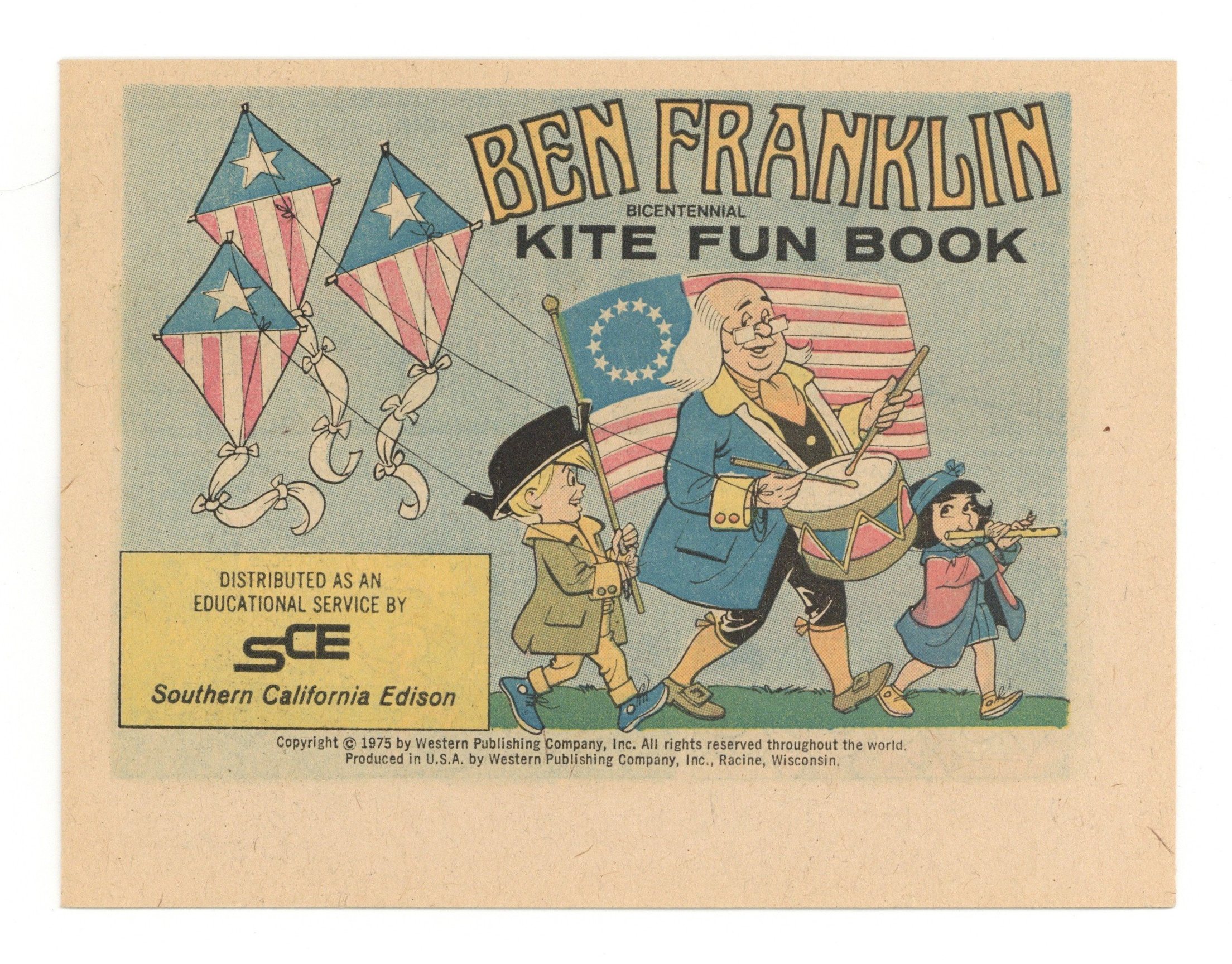 Tags: Kite Fun BookPublished 1975 by Reddy Kilowatt Inc..$27.00Ben Franklin Kite Fun Book (1975) is a promotional comic distributed by Reddy Kilowatt, Inc. via investory-owned utility companies. Ben Franklin joins Reddy Kilowatt in a story about kite safety and fun. The back cover features Reddy's Kite Safety Rules. 16 pages, full color, newsprint, 7-in. x 5-in., no cover price.