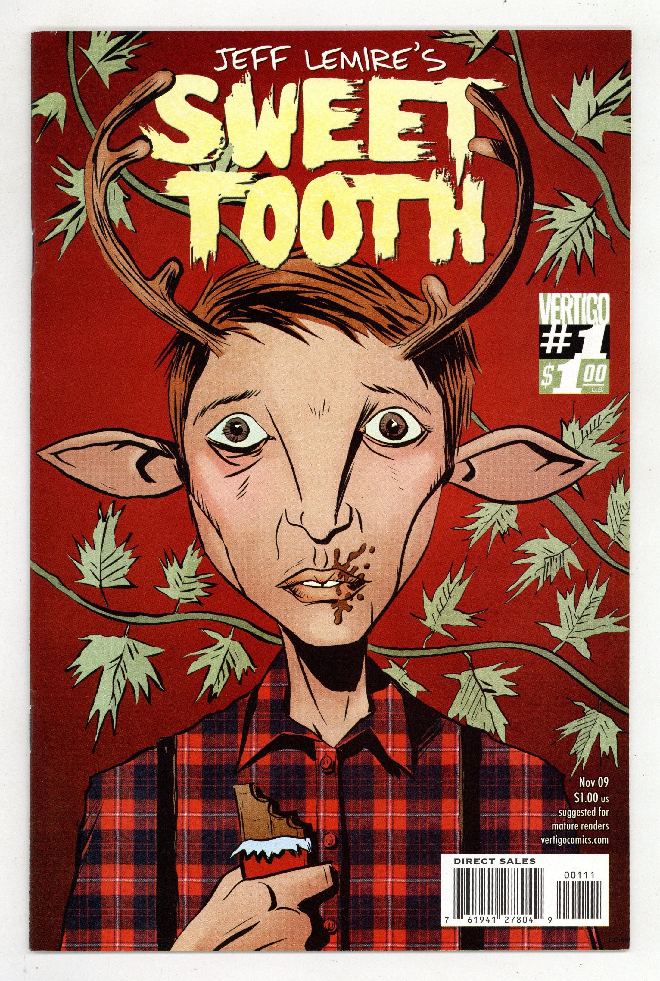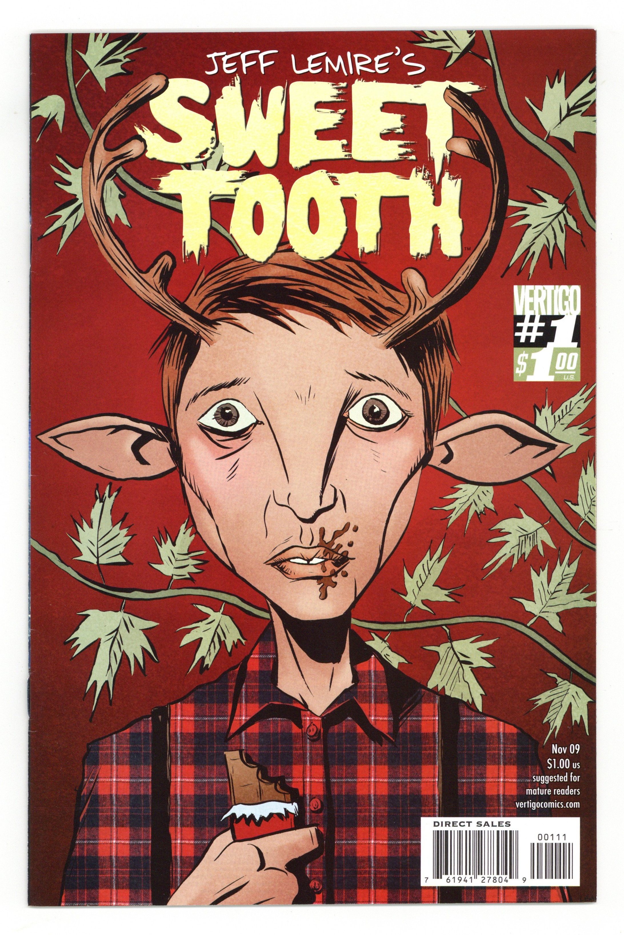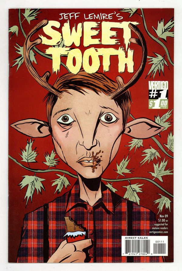 Story, Art and cover by Jeff Lemire. From out of the deep woods and the mind of acclaimed indie cartoonist Jeff Lemire (THE NOBODY, The Essex County Trilogy) comes a new Vertigo monthly ongoing series like no other! After being raised in total isolation, Gus - a boy born with deer-like antlers - is left to survive in an American landscape devastated a decade earlier by an inexplicable pandemic. Even more remarkable is that Gus is part of a rare new breed of human/animal hybrid children who have emerged in its wake, all apparently immune to the infection. Enter Jepperd, a violent, hulking drifter who soon takes in Gus and promises to lead him to 'The Preserve,' a fabled safe-haven for hybrid children. Along the way they'll have to contend with science militias, deadly scavengers, rival bounty hunters, and hybrid worshipping cultists as they fight to make it to safety and solve the mysteries of this deadly new frontier. This bizarre and haunting new series is boldly written and illustrated by Eisner-nominated creator Jeff Lemire and elegantly colored by fellow Eisner nominee Jose Villarubia. A little boy with antlers, a big man with guns, a world without hope32 pages, full color. MATURE READERS. Cover price $1.00.