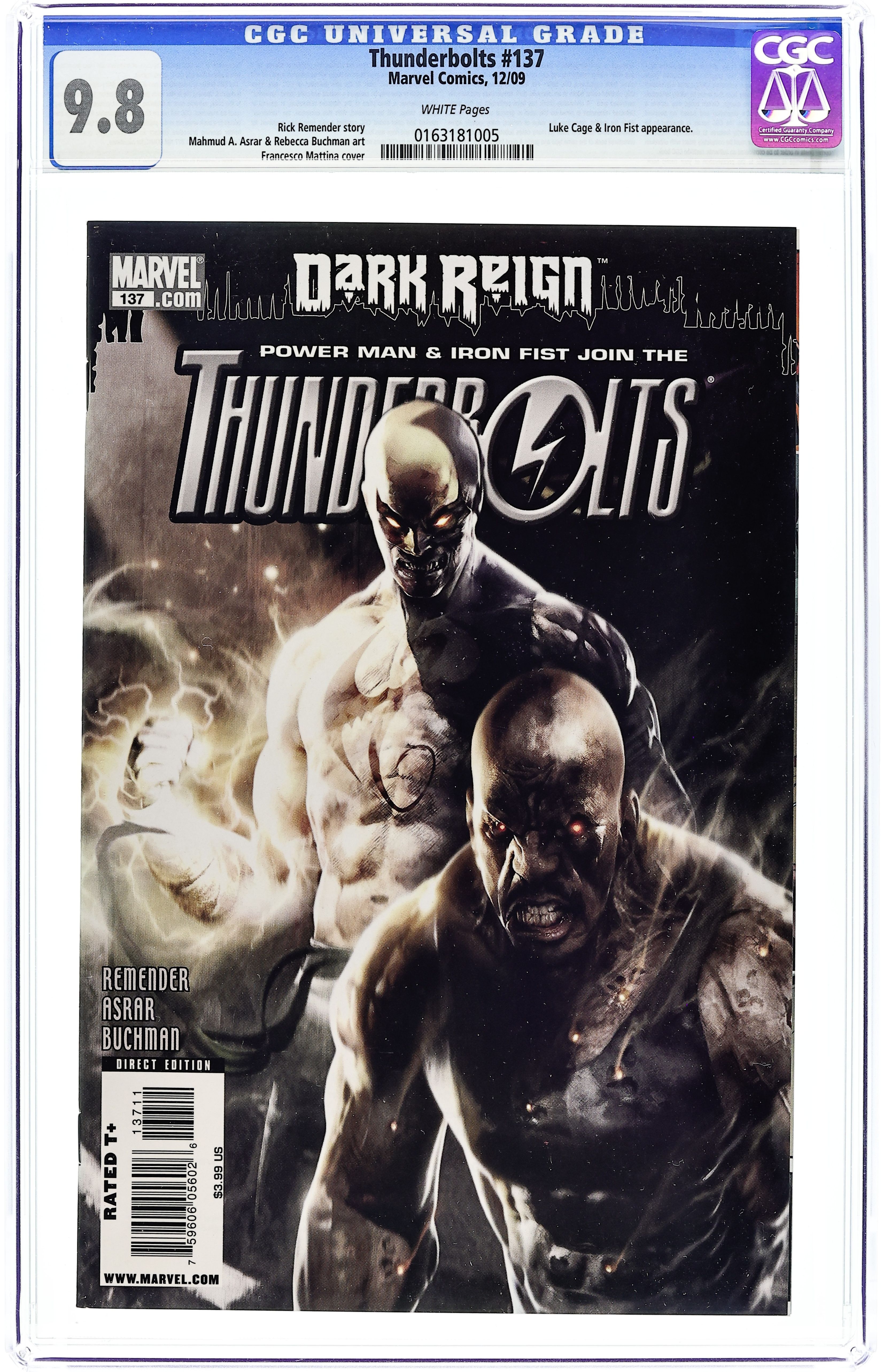 Dark Reign tie-in - Written by RICK REMENDER. Art by MAHMUD ASRAR and REBECCA BUCHMAN. Cover by FRANCESCO MATTINA. Meet the newest Thunderbolts...Power Man and Iron Fist?! Norman Osborn, in need of a powerful duo to send on a top secret mission, makes the former Heroes for Hire a deal they can't refuse! Luke Cage and Danny Rand have no choice but to become Osborn's personal assassins! What could have caused all this? Fan favorite writer Rick Remender (PUNISHER) spills all the secrets-and some blood--in this 100 proof double-sized blow-out! 48 pages, full color. Cover price $3.99.