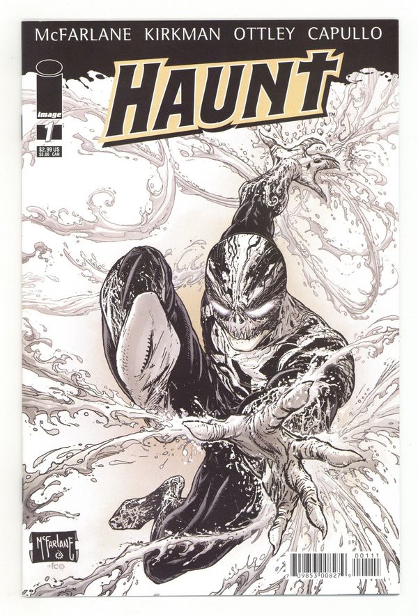 Cover by TODD MCFARLANE. Written by ROBERT KIRKMAN. Art by GREG CAPULLO, RYAN OTTLEY and TODD McFARLANE. McFARLANE and KIRKMAN'S HAUNT HAS ARRIVED! Daniel Kilgore is dragged into his estranged brother Kurt's secret life of murder and espionage... by his ghost. With no training whatsoever, guided by the spirit of his secret-agent brother, Daniel must now solve his brother's murder and save the world - or die trying! It all starts here, people: Witness the birth of HAUNT! 32 pages, full color. Cover price $2.99.