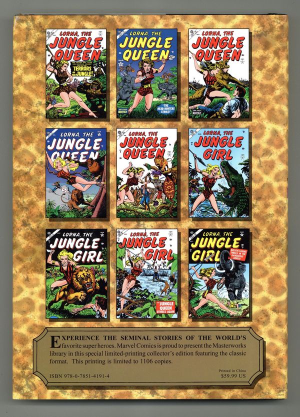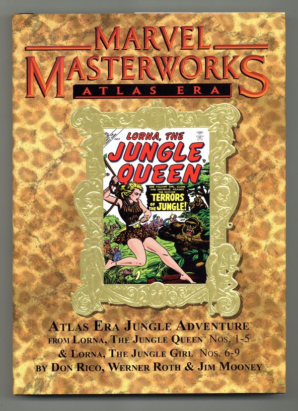 Volume 131 - 1st printing. "Atlas Era: Jungle Adventure!" Collects Lorna, the Jungle Queen (1953-1957) #1-9 (NOTE: #6-9 were LORNA, THE JUNGLE GIRL). Written by DON RICO. Art by WERNER ROTH, JIM MOONEY, JOHN BUSCEMA, GEORGE TUSKA, SYD SHORES and JIMMY INFANTINO. Cover by CARL BURGOS. LEOPARD-PRINT NEVER LOOKED SO GOOD! Beginning the complete collection of Atlas' action-packed 1950s jungle adventure comics, the Marvel Masterworks venture into the oh, so attractive heart of darkness to meet Lorna, the Jungle Queen! Her jungle-faring father mauled by a lion, the seventeen-year-old Lorna embraces her unexpected new home - becoming a fierce and stunning girl of the wild and the last word in jungle justice! Trained in the ways of the African wilderness by her mentor, M'Tuba, Lorna is joined by her ever-helpful monkey companion, Mikki, and the bold, two-fisted hunter, Greg Knight. From the murky Black Swamp to the Dead Lake, the pre-Code adventures of Lorna and her cast of characters find them pitted against vicious headhunters, voodoo priestesses, killer cavemen from the Lost City, and Agu the Giant-a gorilla that could give King Kong a run for his money! You'll also enjoy the tale of two Lornas and stalk creatures both strange and fierce as Lorna uncovers all the mysteries of the jungle. With lush artwork by Werner Roth at his career best, forget it, this is a jungle adventure from which there's no coming back. Get ready to go wild with ATLAS ERA JUNGLE ADVENTURES MASTERWORKS! Hardcover, 248 pages, full color. Cover price $59.99.