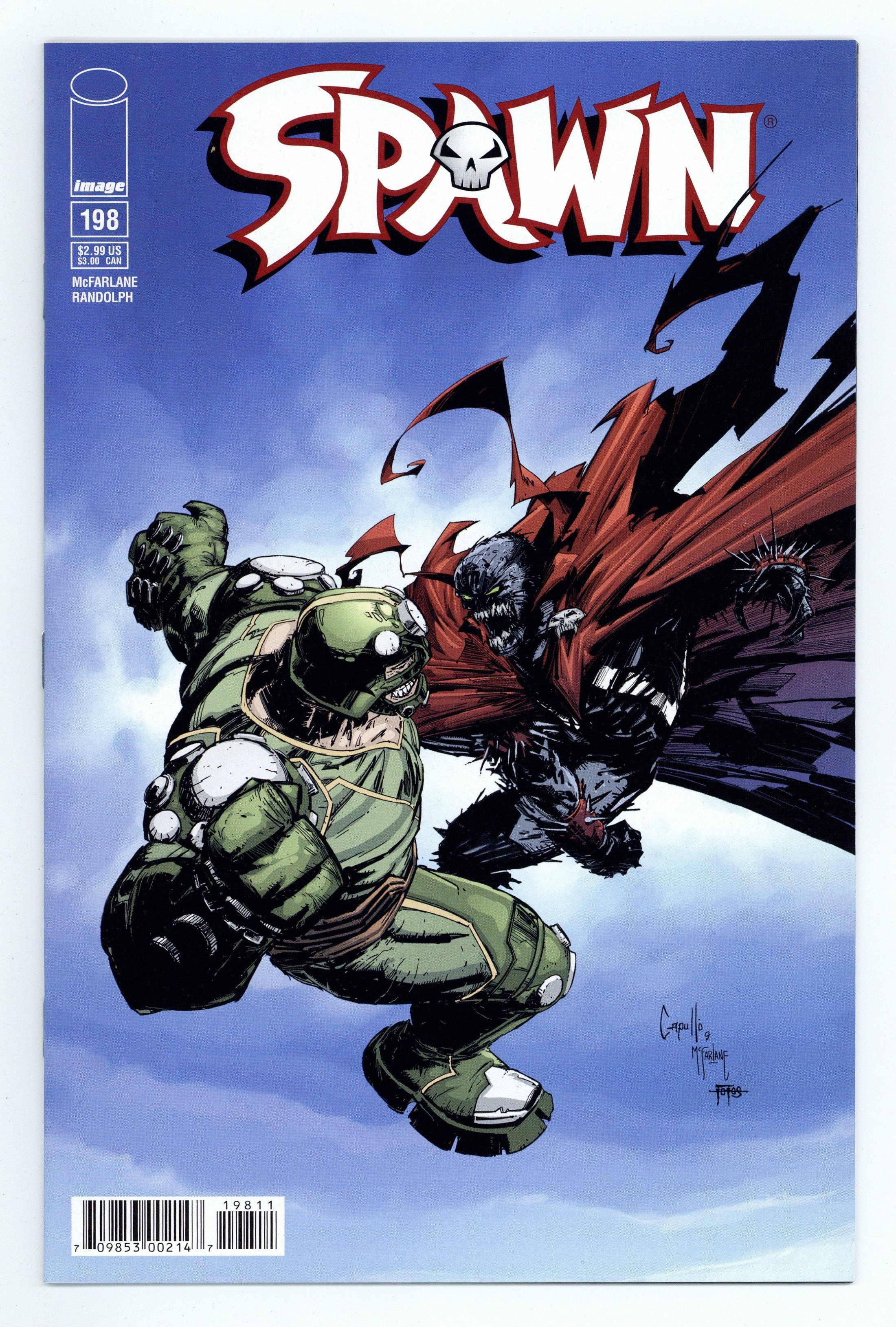 Written by TODD McFARLANE. Art by KHARY RANDOLPH and McFARLANE. Cover by GREG CAPULLO and McFARLANE. THE COUNTDOWN TO SPAWN #200 BEGINS HERE! Spawn's biggest, most menacing villain to date joins the cast of rogue characters in this month's issue. Jim discovers he wasn't the only patient with secrets at St. Anthony's and finds answers to his true identity in the last place he ever expected. Cover price $2.95.