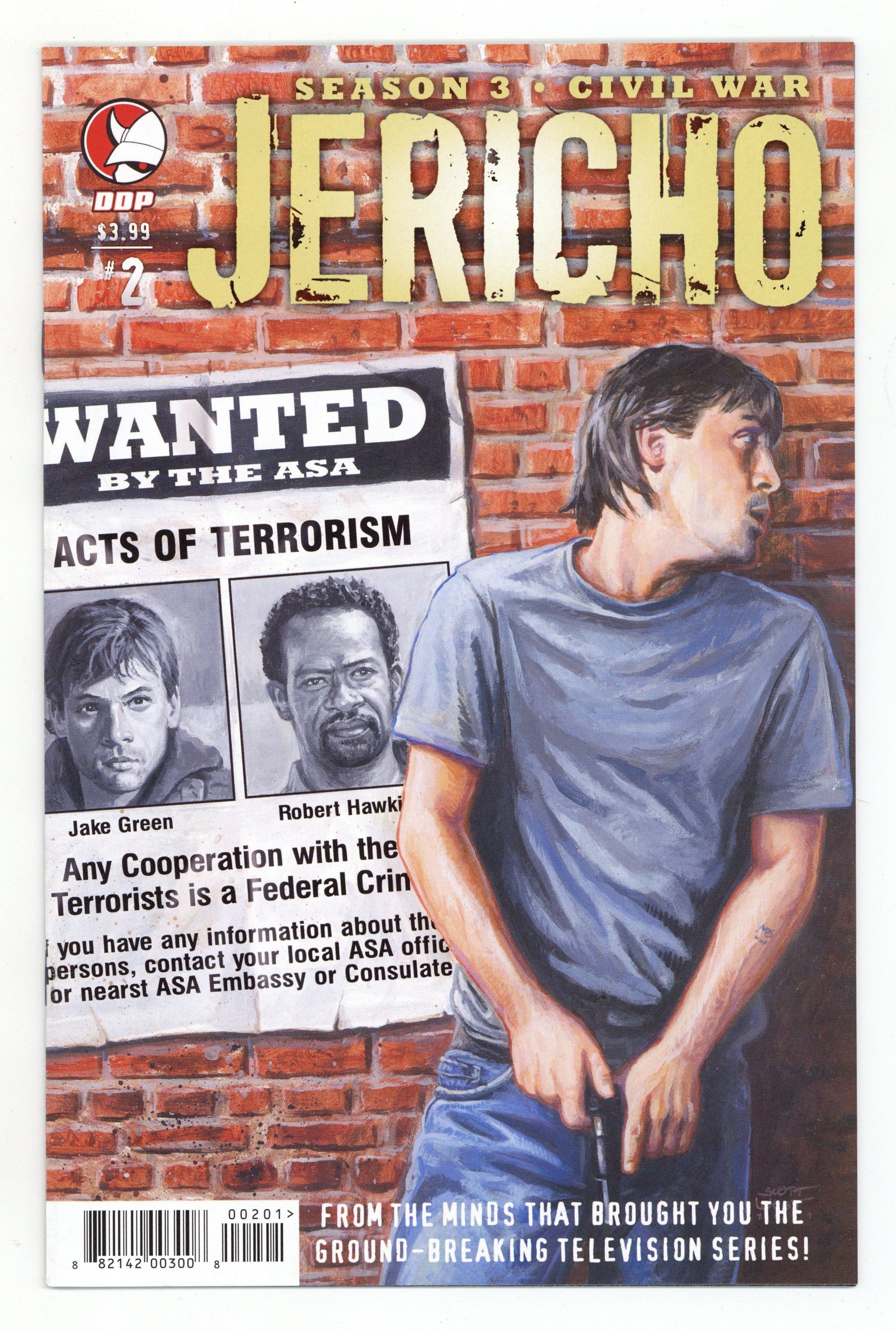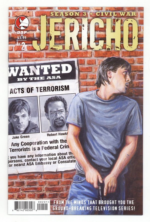 Published Nov 2009 by Devil's Due.$8.00Cover by Scott West. Written by Dan Shotz, Robert Levine & Jason M. Burns. Art by Matt Merhoff. From the minds of the Jericho writing team and written by Jason M. Burns, the second installment of Jericho: Season Three: Civil War finds Jake and Hawkins on the road as Wanted Men. Forced to enter into enemy territory, they must use the help of the Jericho Resistance to make their way through an Allied States processing town on the Texas Border. Disguised as refugees, our heroes must maneuver past hi-tech cameras, armed ASA soldiers and local black market thugs to continue their mission to find terrorist John Smith. Cover price $3.99.