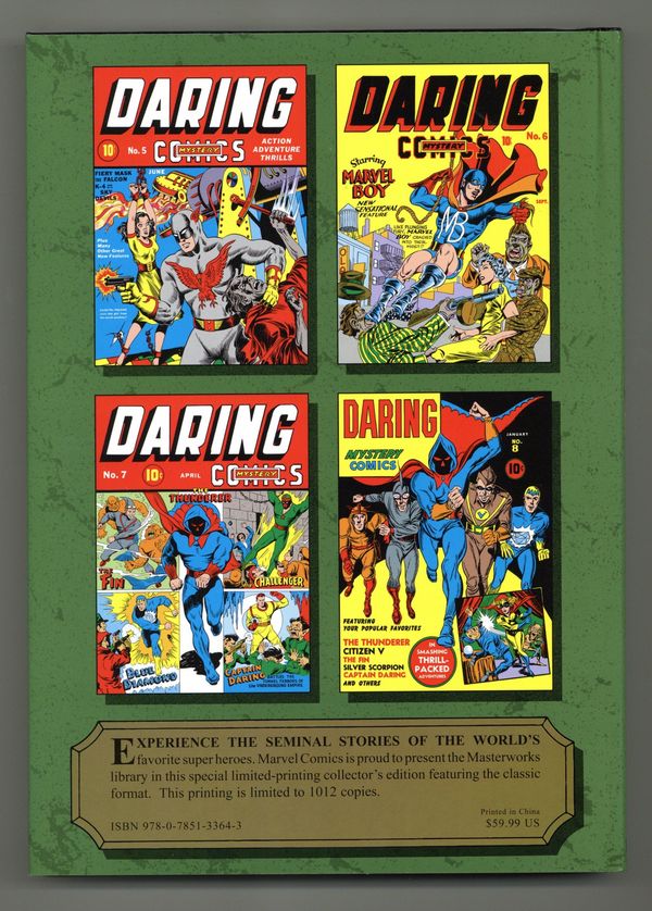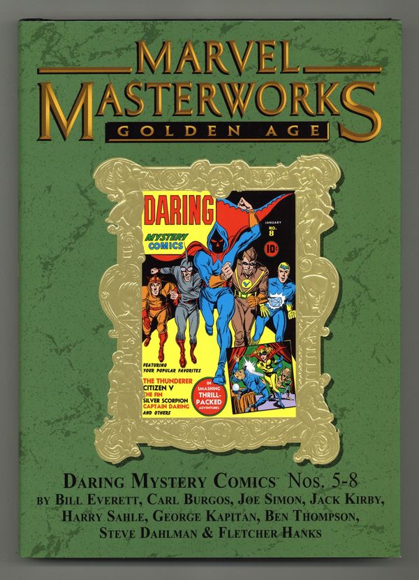Volume 133 - 1st printing. "Golden Age: Daring Mystery!" Collects Daring Mystery Comics (1940-1942) #5-8. Written by GEORGE KAPITAN and JOHN COMPTON. Art by JACK KIRBY, JOE SIMON, BILL EVERETT, CARL BURGOS, BEN THOMPSON, STEVE DAHLMAN, GEORGE KLEIN, HARRY SAHLE, LARRY ANTONETTE, ED ROBBINS, MAURICE GUTWIRTH, HARRY DOUGLAS, HENRY FLETCHER, FRED SCHWAB, BUD SAGENDORF, FRANK PRETSCH, and FRANK BORTH. Cover by JACK KIRBY. There's no age like the Golden Age! Timely Comics' second, sensational comic book series started off with an eclectic array of heroes and artistic talents that mixed pulp rawness with the exploding energy of the comic book medium. Now, with a fix on the new field, DARING MYSTERY COMICS brings in the big guns and lets loose! Featuring a who's who of Golden Age talent, these stories are a rollicking ride through the frenetic era that gave birth to America's greatest fictional creation, the super hero. Joe Simon and Jack Kirby bring you the original Marvel Boy, the 31st century space opera of Captain Daring, and the Fiery Mask. Bill Everett, master of the maritime hero, creates The Fin-Robin Hood of the Seas. Carl Burgos's Thunderer debuts as the powerhouse of justice. Ben Thompson unleashes the Blue Diamond, bullet-proof man. Harry Sahle introduces the super heroine Silver Scorpion. And Citizen V battles his way across war-torn Europe for victory! Also featuring Dynaman, Trojak the Tiger Man, K-4 and His Sky Devils, Monako Prince of Magic, Marvex the Super Robot, Breeze Barton, Stuporman, the Flying Flame and Mr. Million, DARING MYSTERY COMICS is a cornucopia of action and adventure! Hardcover, 280 pages, full color. Cover price $59.99.