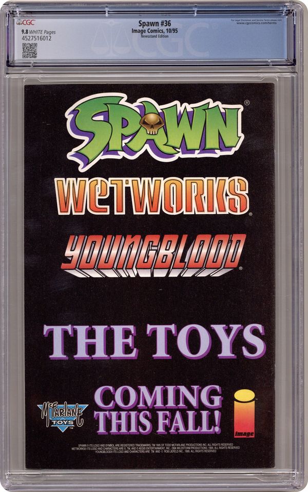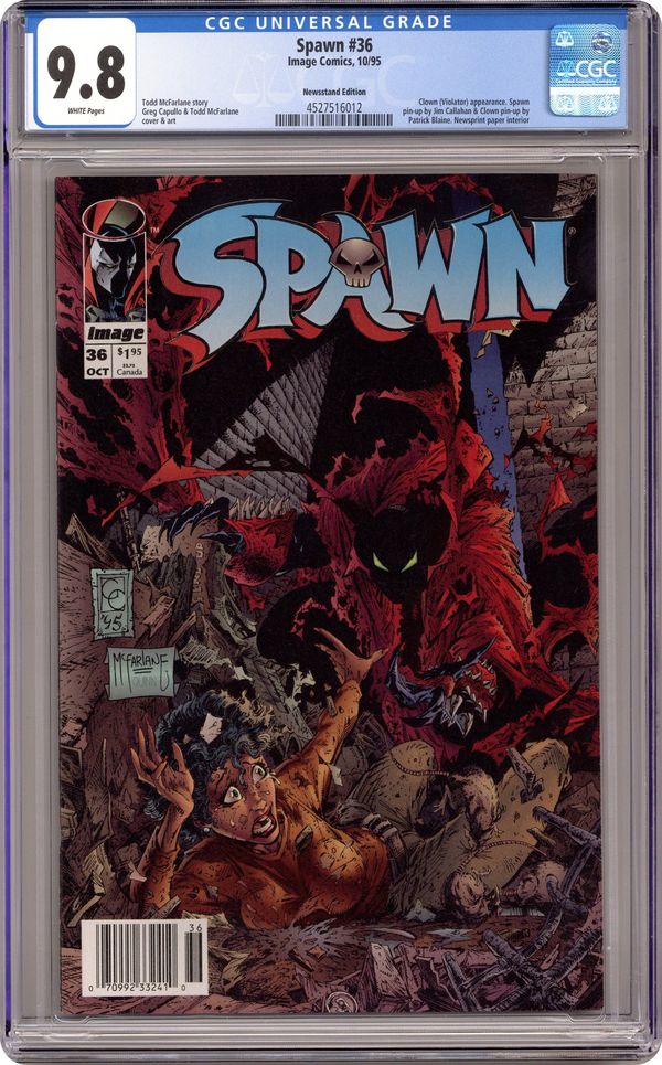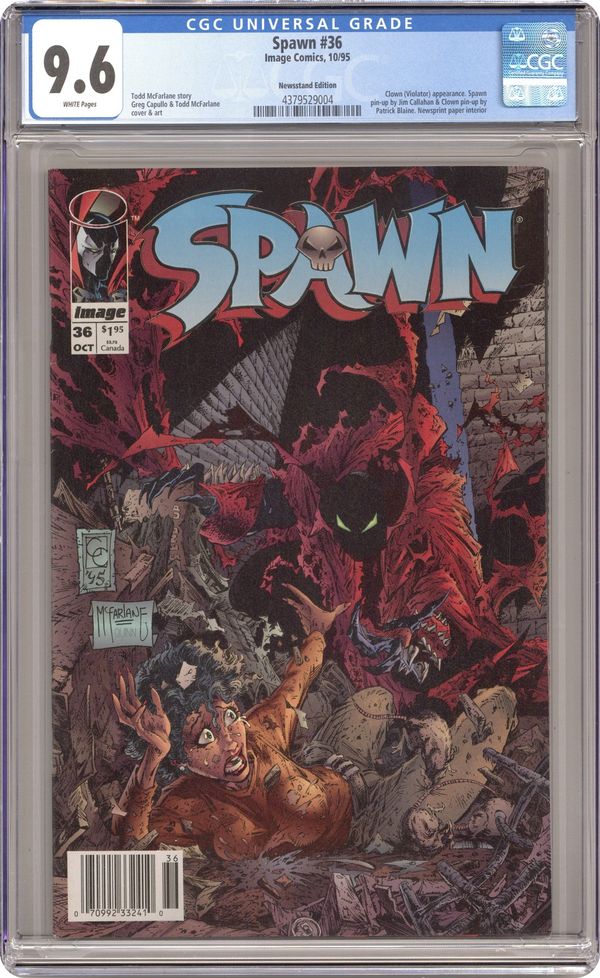 Newsstand Edition (has bar code on cover). "Set Up!" Part 2 of 2. Story by Todd McFarlane. Art by Greg Capullo and Todd McFarlane. Terry prevents Spawn from Murdering Jason Wynn. Spawn accuses his former best friend of being a traitor but he doesn't realize that Terry is trying take down Wynn himself by working undercover. Plus, Spawn finally tries to tell Wanda who he really is. Includes 2 pin-ups by Jim Callahan (Spawn) and Patrick Blaine (Violator/Clown). Cover price $1.95.