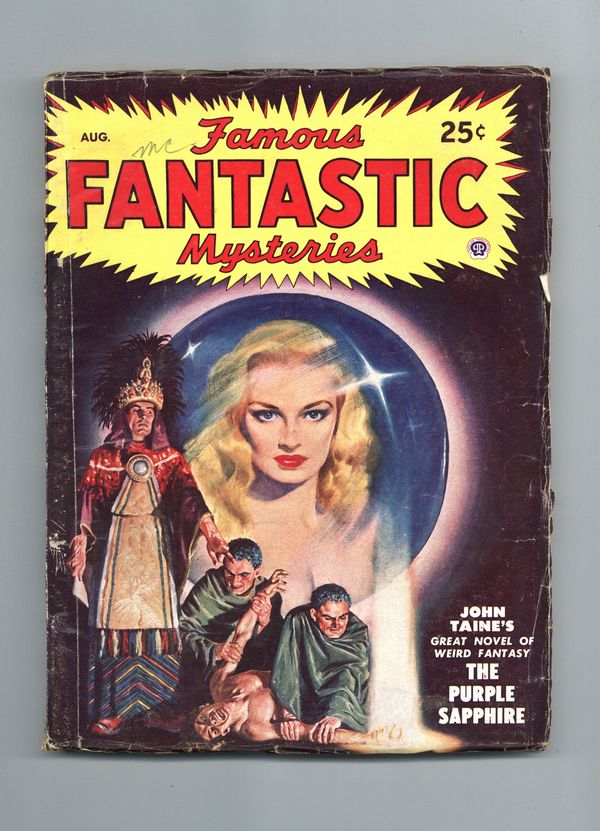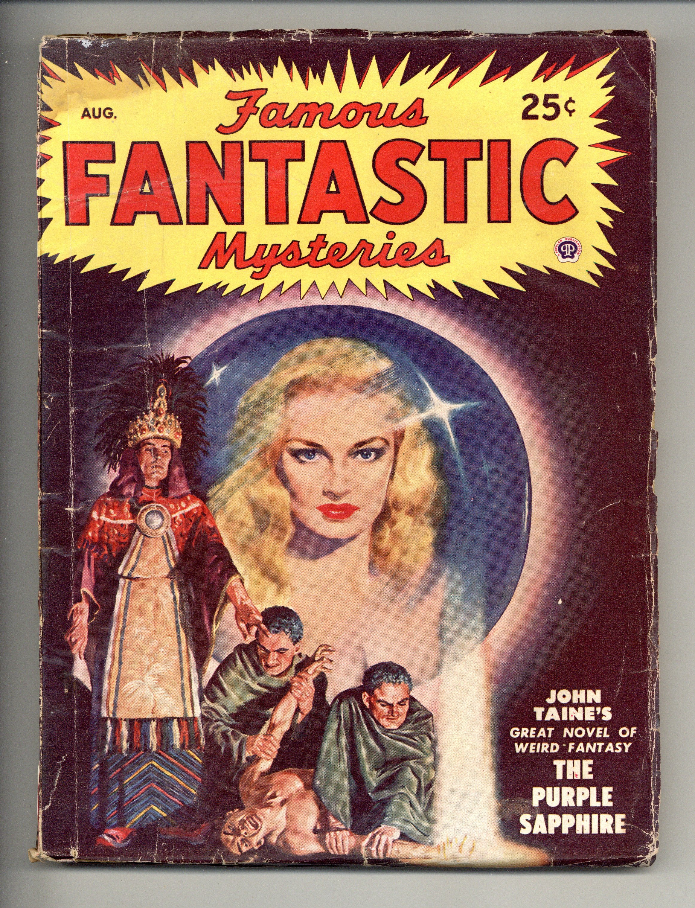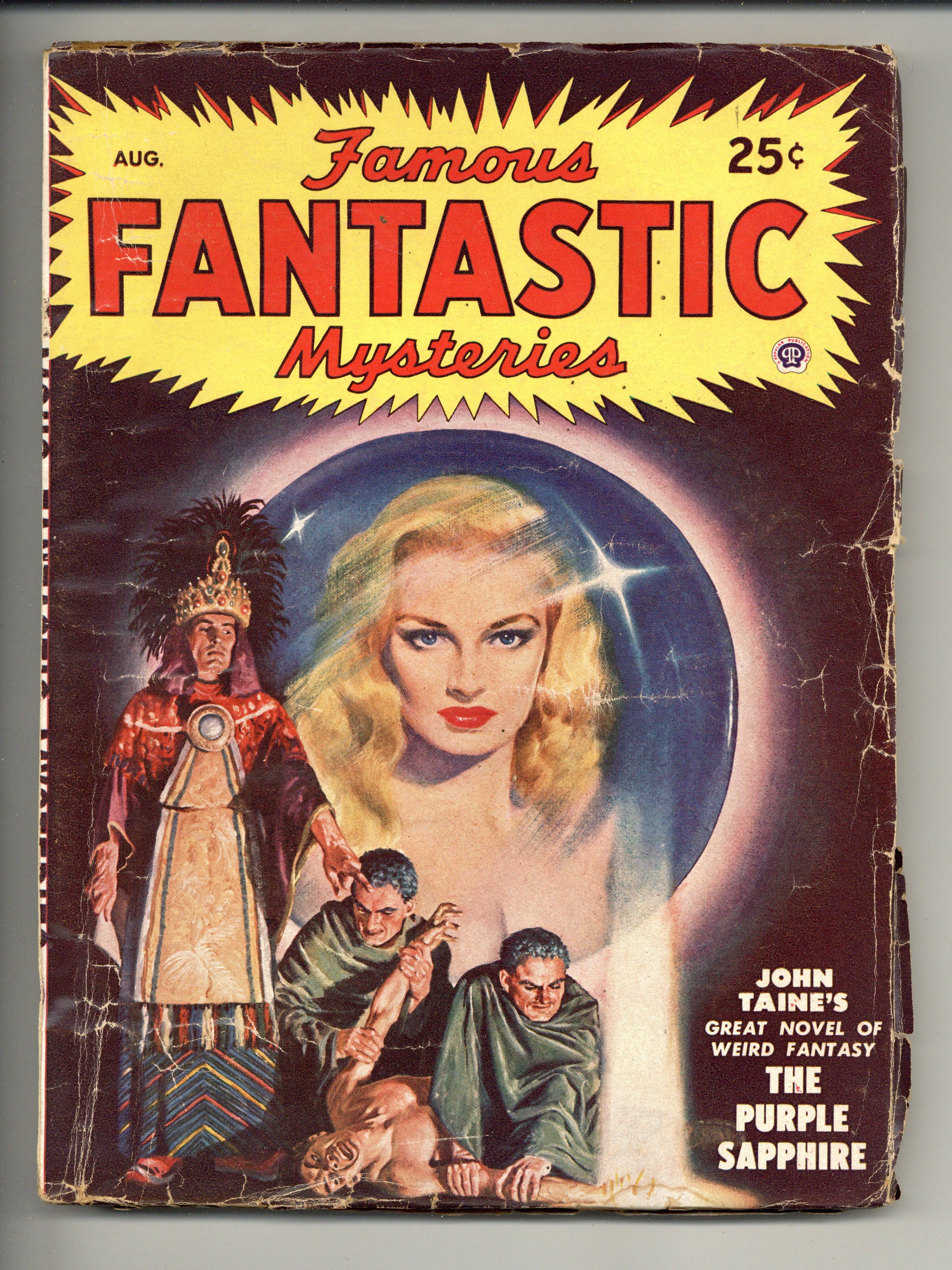Aug 1948. Cover by Lawrence. "The Purple Sapphire" by John Taine and "The Night Before the End of the World" by Murray Leinster. Interior illustrations by Virgil Finlay and Leydanfrost. 7-in. x 9 1/2-in.; black and white; 128 newsprint pages. Published by Popular Publications Cover price $0.25.