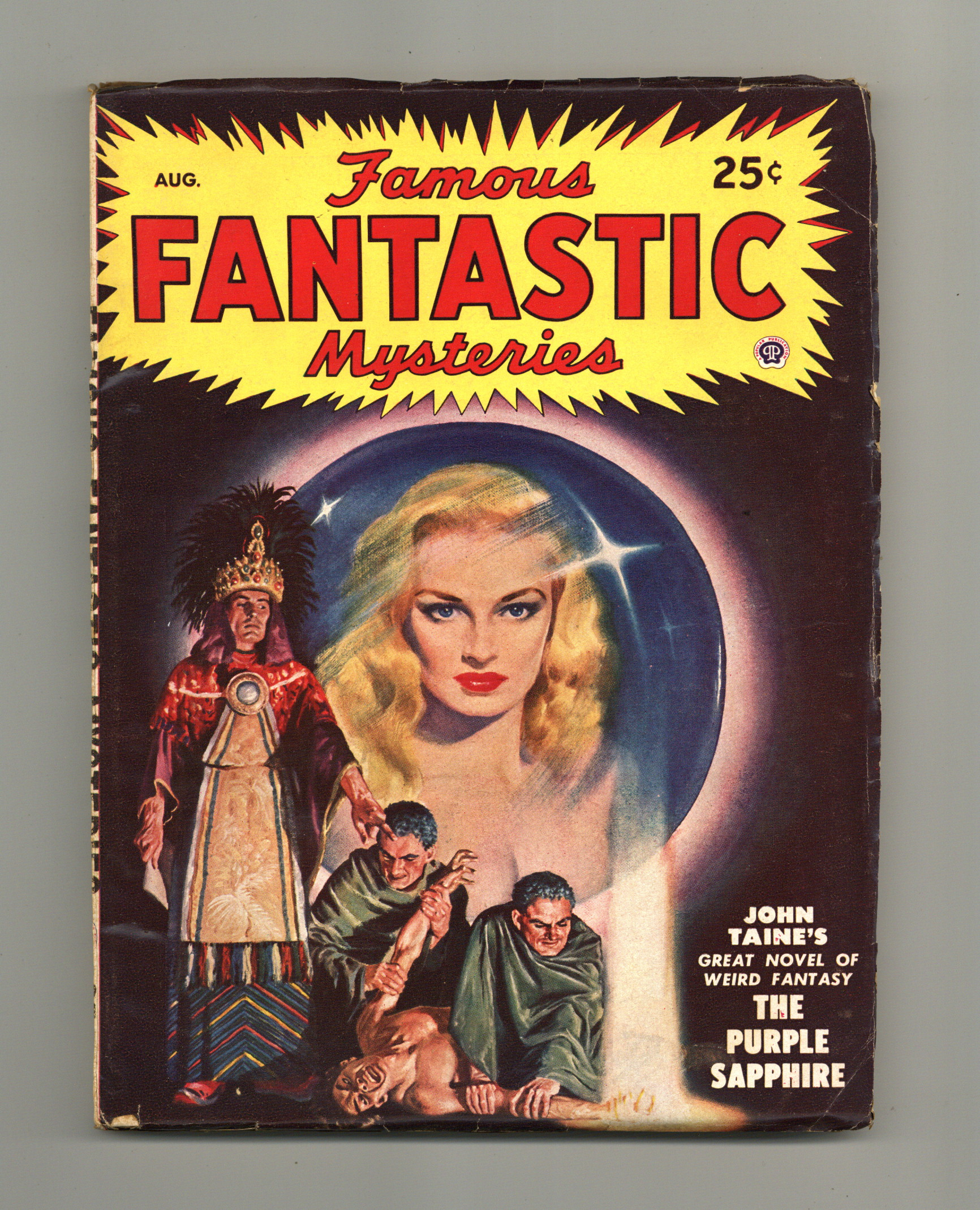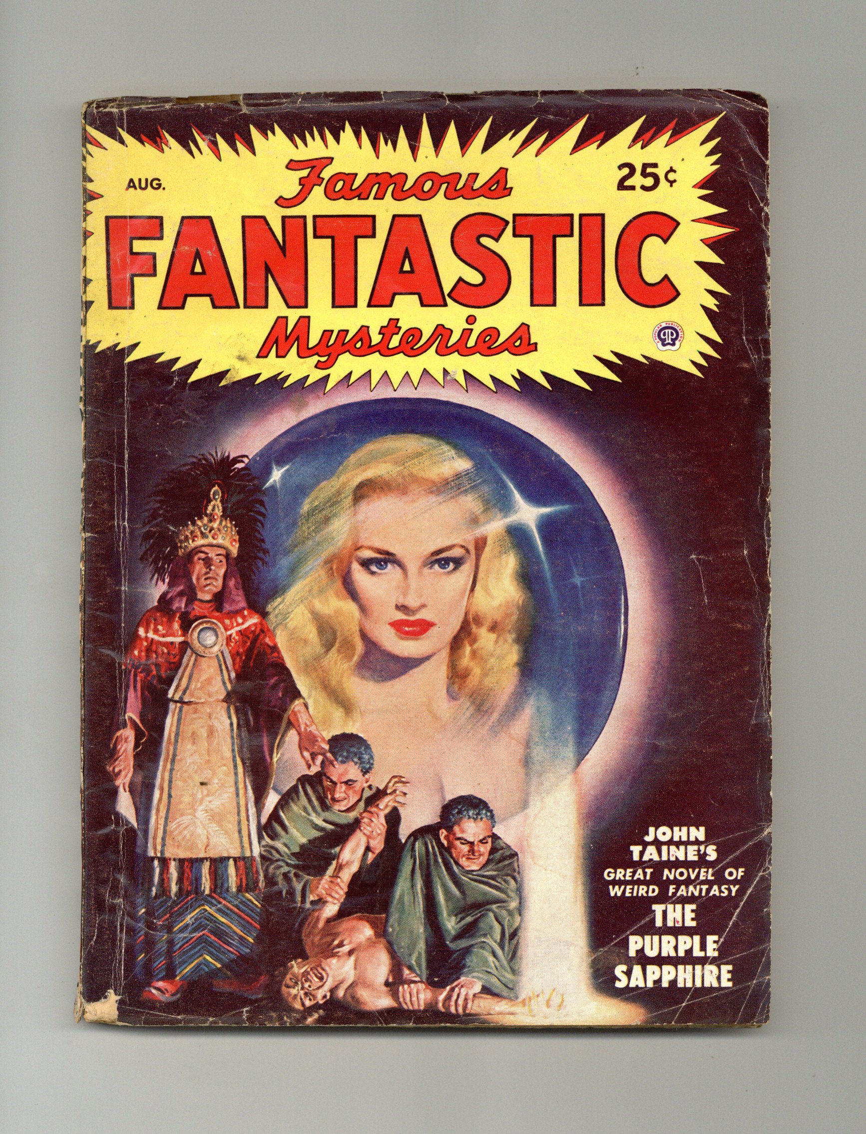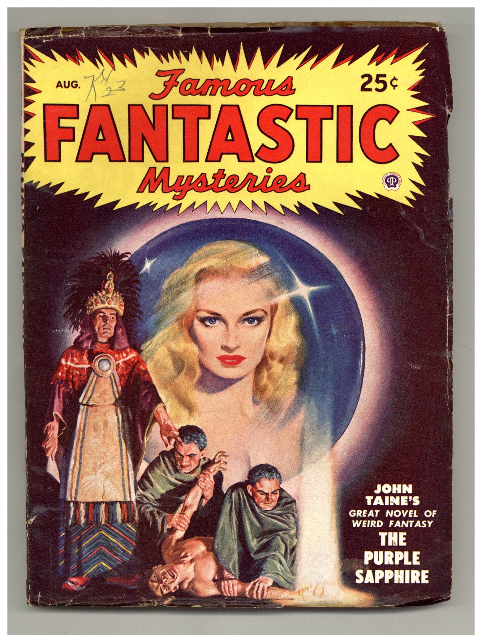 Aug 1948. Cover by Lawrence. "The Purple Sapphire" by John Taine and "The Night Before the End of the World" by Murray Leinster. Interior illustrations by Virgil Finlay and Leydanfrost. 7-in. x 9 1/2-in.; black and white; 128 newsprint pages. Published by Popular Publications Cover price $0.25.