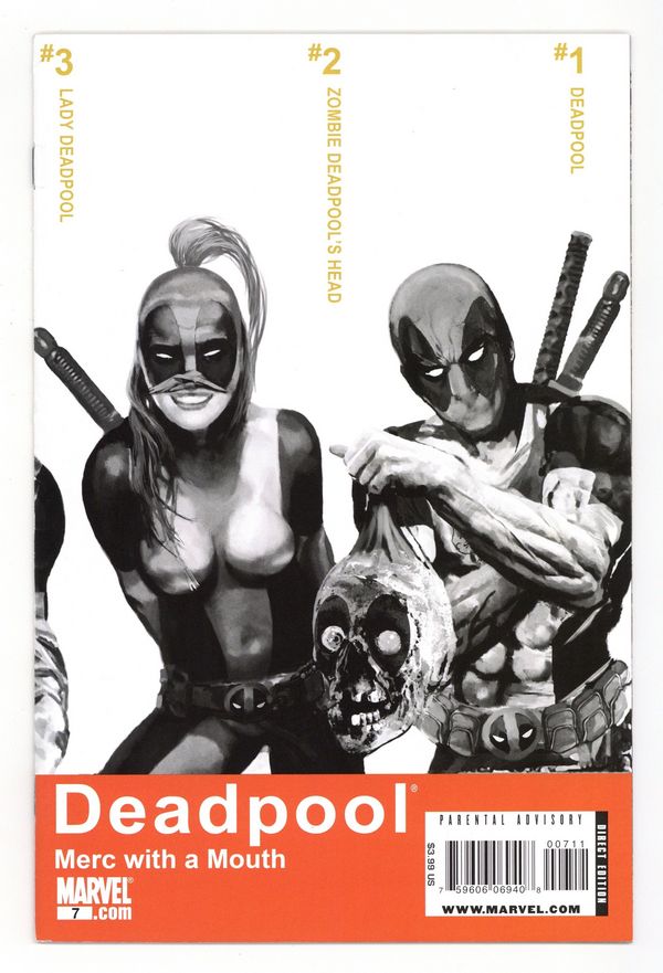 $80.00Wraparound Cover by ARTHUR SUYDAM. Written by VICTOR GISCHLER. Art by ROB LIEFELD, KYLE BAKER, DAS PASTORAS and BONG DAZO. 'ARE YOU THERE, DEADPOOL? IT'S ME DEADPOOL.' Special double-sized issue with art by ROB LIEFELD, KYLE BAKER, DAS PASTORAS and regular series artist BONG DAZO. What do you do with a homesick zombie head? Take it back to the zombie universe, of course! Hopping through an interdimensional portal in the Florida swamp with Headpool tucked under his arm, Deadpool soon finds himself bouncing through a series of outlandish alternate realities, each more warped than the last. Wade Wilson, say hello to Major Deadpool, the Deadpool Kid and - va-va-voom - Lady Deadpool. 40 pages, full color. Cover price $3.99.