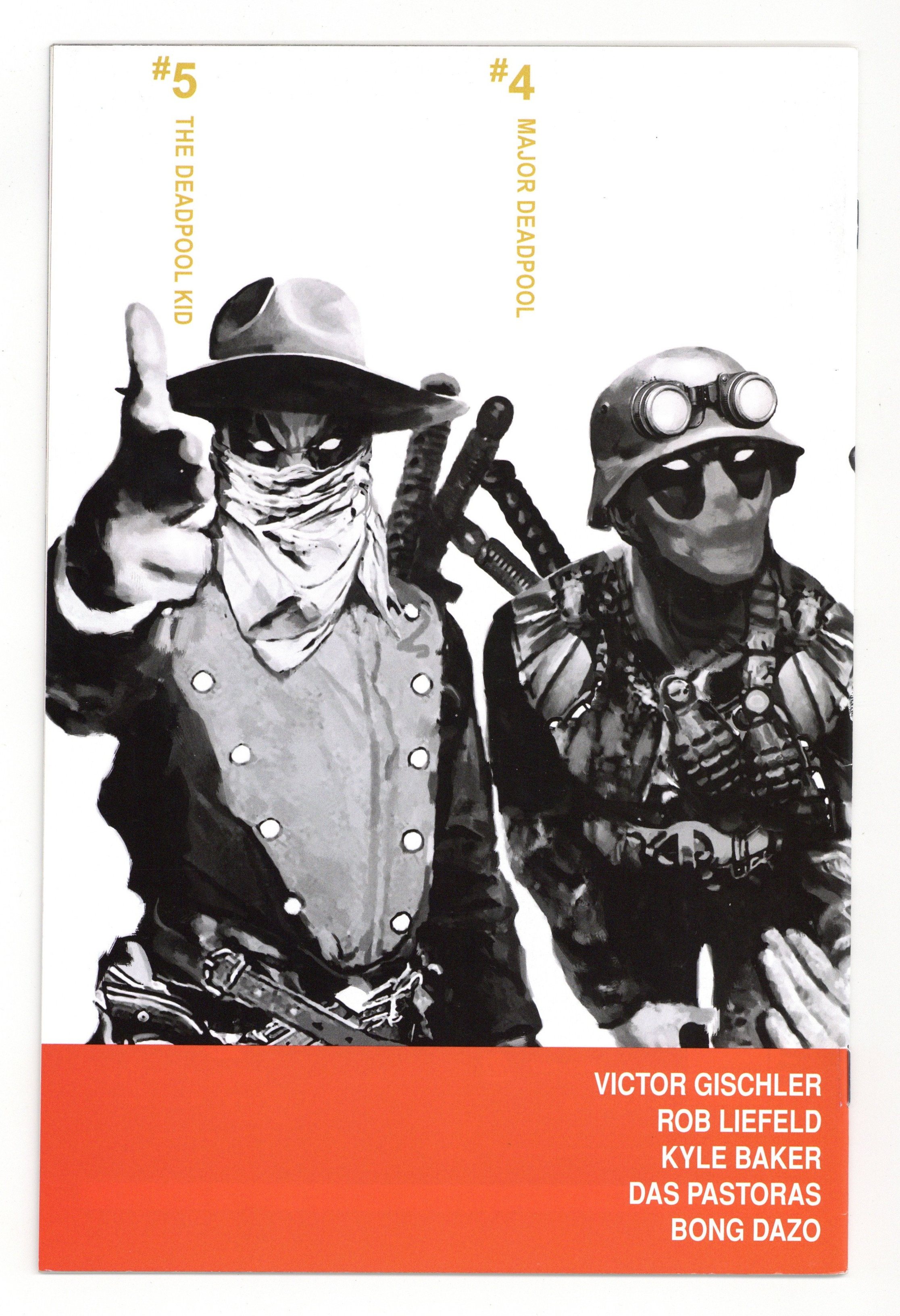Wraparound Cover by ARTHUR SUYDAM. Written by VICTOR GISCHLER. Art by ROB LIEFELD, KYLE BAKER, DAS PASTORAS and BONG DAZO. 'ARE YOU THERE, DEADPOOL? IT'S ME DEADPOOL.' Special double-sized issue with art by ROB LIEFELD, KYLE BAKER, DAS PASTORAS and regular series artist BONG DAZO. What do you do with a homesick zombie head? Take it back to the zombie universe, of course! Hopping through an interdimensional portal in the Florida swamp with Headpool tucked under his arm, Deadpool soon finds himself bouncing through a series of outlandish alternate realities, each more warped than the last. Wade Wilson, say hello to Major Deadpool, the Deadpool Kid and - va-va-voom - Lady Deadpool. 40 pages, full color. Cover price $3.99.