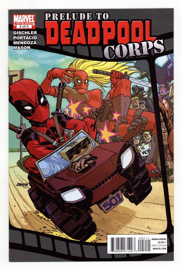 Written by VICTOR GISCHLER. Art by WHILCE PORTACIO. Cover by DAVE JOHNSON. Witness the birth of the most important super hero team ever in a universe-spanning event that will rock the month of March! Wade Wilson has been tapped to save the Universe, and to do that he's going to need help. Enter: The sexy-but-insecure Lady Deadpool! The devious-but-lovable Headpool (a.k.a. the Zombie Deadpool Head)! The bratty-but-brilliant Kidpool! And the irascible mutt known as Dogpool! Individually, they're, well, kind of messed up, but together, they're the unstoppable force know as DPC. 32 pages, full color. Cover price $2.99.