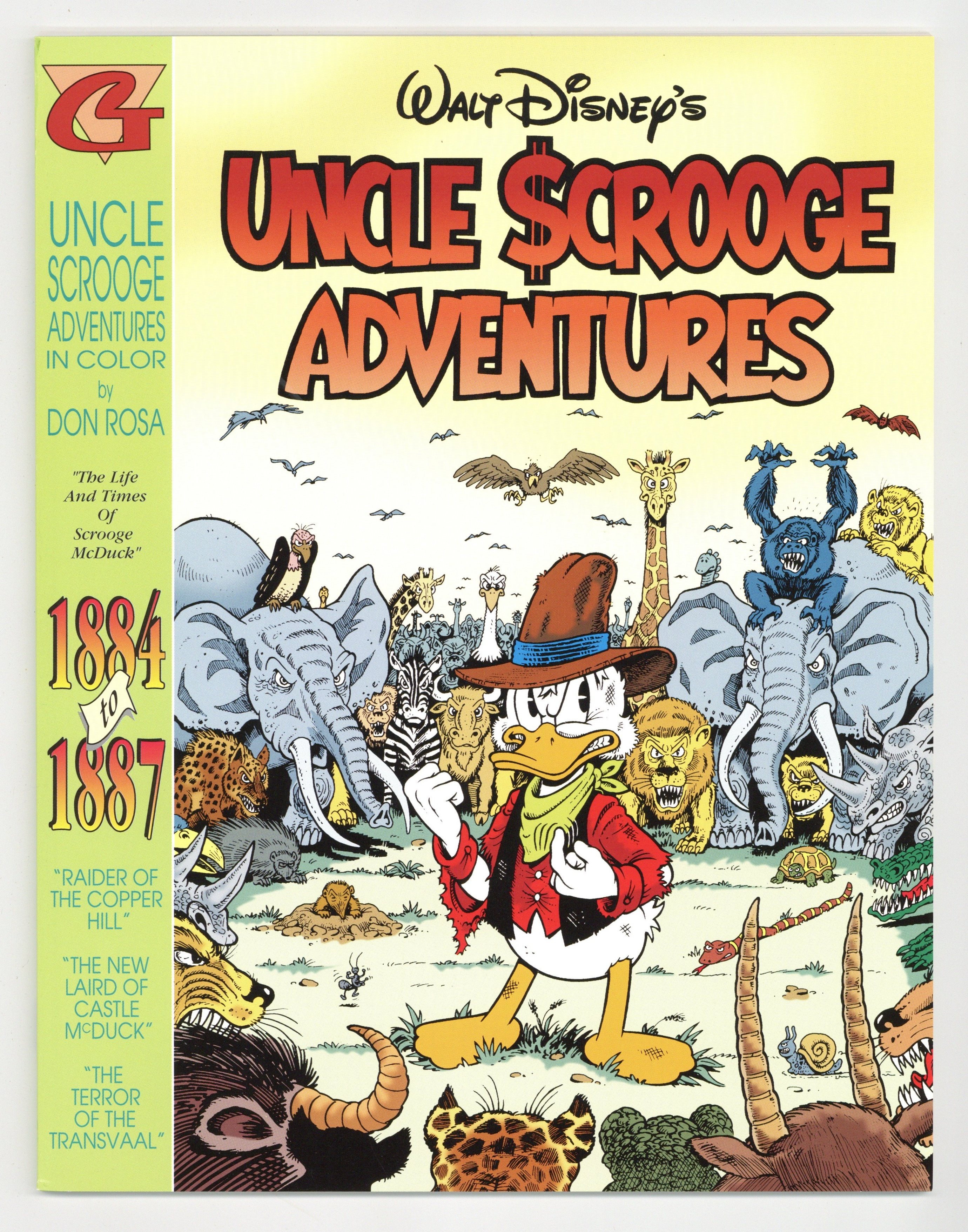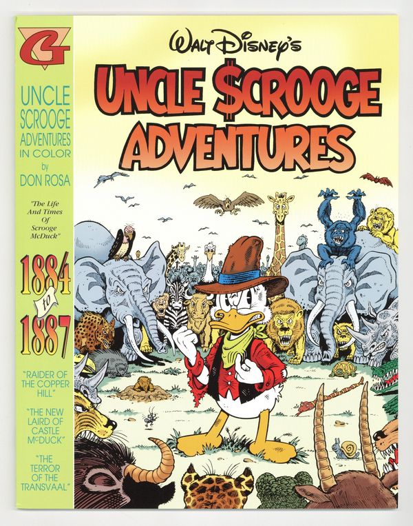 $13.00"The Life and Times of Scrooge McDuck" 1884 to 1887. Cover by Don Rosa. Stories and art by Don Rosa. This special Gladstone series reprints the entire "Life and Times of Scrooge McDuck saga by legendary Duck artist Don Rosa, based on the continuity of the Carl Barks Scrooge stories. Issues originally came factory bagged with a trading card. In 1884, Scrooge becomes involved in the Copper Rush. In 1885, he returns to Scotland and the Whiskerville rivalry. In 1887, he meets Flintheart Glomgold for the first time in Africa. Plus an article about Don Rosa's work creating his epic saga, The Life and Times of Scrooge McDuck. Raider of the Copper Hill; The New Laird of Castle McDuck; The Makings of The Life and Times of Scrooge McDuck; The Terror of the Transvaal. NOTE: May or may not come with trading card. 8 1/2-in. x 11-in., 44 pages, Full Color. Cover price $10.95.