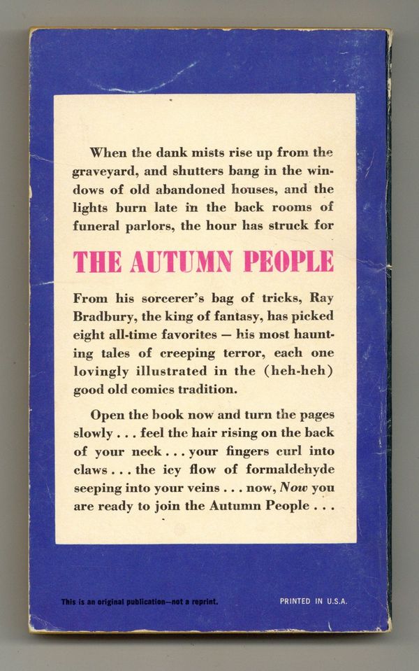 1st printing. Based on the stories by Ray Bradbury. Adapted for EC Comics by Albert Feldstein. Art by Graham Ingels and Jack Davis. Cover painting by Frank Frazetta. Foreword by Ray Bradbury. A collection of EC Comics based on the fantastic stories by horror legend Ray Bradbury. Includes "There Was an Old Woman," "The Screaming Woman," "Touch and Go," "The Small Assassin," "The Handler," "The Lake," "The Coffin," and "Let's Play Poison." Softcover, 4-in. x 7-in., 192 pages, B&W. Cover price $0.50.