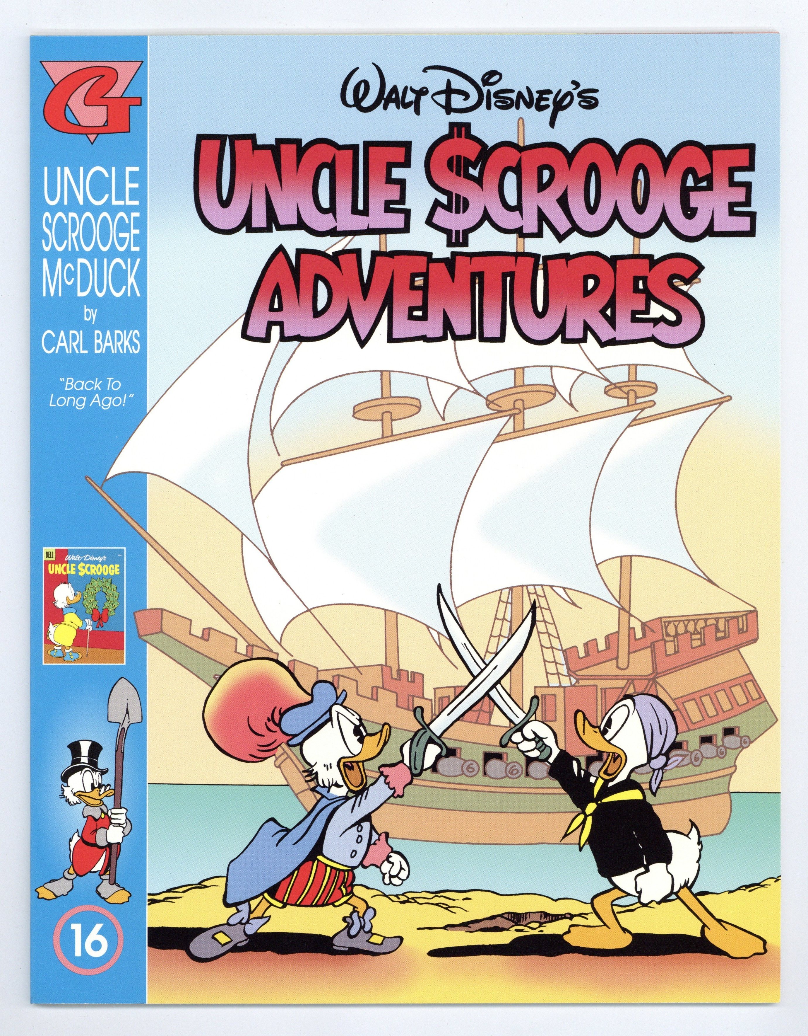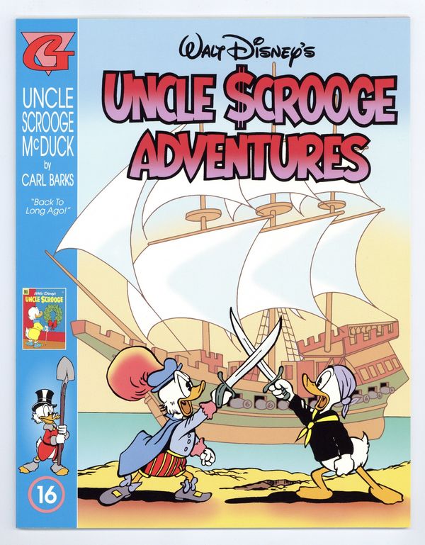 $12.50Cover by Carl Barks. Stories and art by Carl Barks and Geoffrey Blum. Gladstone presents classic Scrooge stories by Carl Barks and behind-the-scenes articles, originally factory bagged with a trading card. A hypnotist reveals Scrooge's past life as pirate Matey McDuck, who hid a fortune in stolen treasure. Scrooge decides that he must find that treasure before Donald and his nephews do. Uncle Scrooge becomes a contestant on a quiz show, but he learns that winning will put him into a higher tax bracket. Plus an article about the story "Back to Long Ago." Back to Long Ago; The Colossalest Quiz Show; Reincarnations. NOTE: May or may not come with trading card. 8 1/2-in. x 11-in., 32 pages, Full Color. Cover price $8.95.