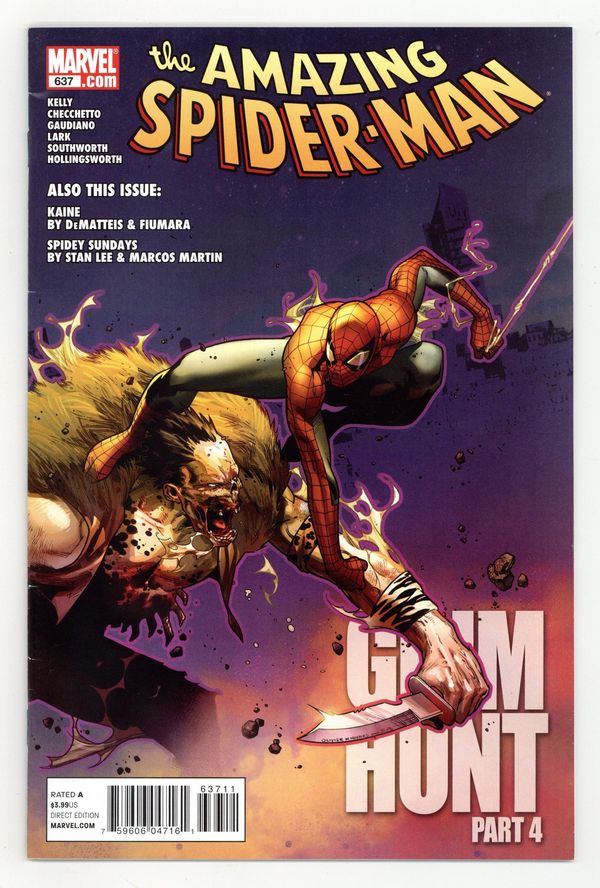 Tags: Marvel Legacy Numbering: Amazing Spider-Man (part 637), Spider-Man Grim Hunt (part 4), Spider-Man$20.00Direct Edition. Cover by OLIVIER COIPEL. Grim Hunt: Part 4 of 4 - Written by JOE KELLY, J.M DEMATTEIS and STAN LEE. Art by MARCO CHECCHETTO, MICHAEL LARK, STEFANO GAUDIANO, MATT SOUTHWORTH, MARCOS MARTIN, MAX FIUMARA and BRIAN THIES. THE LAST STAND OF THE KRAVENS! The Grim Hunt ends with a death in the family...but not the family you may think! Spider-Man's about to learn a violent lesson... that nothing is forever. Plus, more on the untold confrontation between Kraven and Kaine and the amazing 'Spidey Sunday Feature'! 52 Pages, full color. Cover price $3.99.