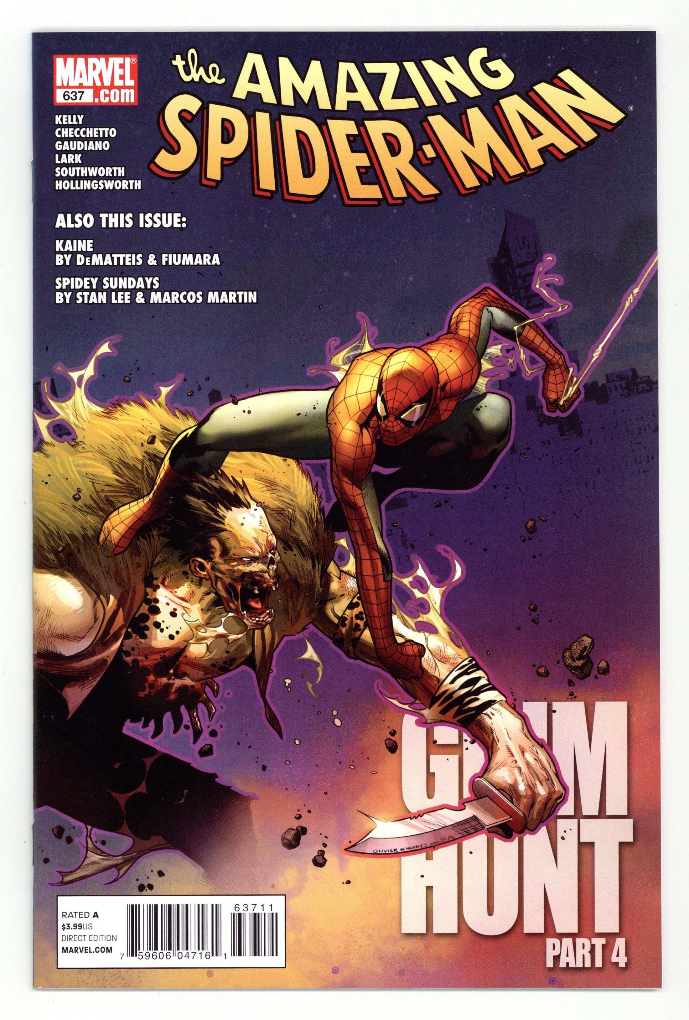 Direct Edition. Cover by OLIVIER COIPEL. Grim Hunt: Part 4 of 4 - Written by JOE KELLY, J.M DEMATTEIS and STAN LEE. Art by MARCO CHECCHETTO, MICHAEL LARK, STEFANO GAUDIANO, MATT SOUTHWORTH, MARCOS MARTIN, MAX FIUMARA and BRIAN THIES. THE LAST STAND OF THE KRAVENS! The Grim Hunt ends with a death in the family...but not the family you may think! Spider-Man's about to learn a violent lesson... that nothing is forever. Plus, more on the untold confrontation between Kraven and Kaine and the amazing 'Spidey Sunday Feature'! 52 Pages, full color. Cover price $3.99.