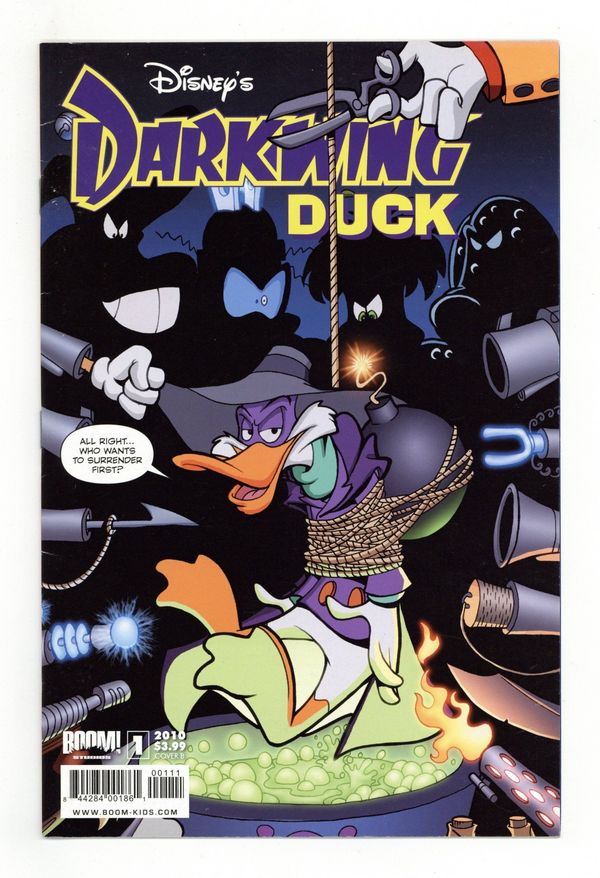 Tags: Disney Ducks & MicePublished Jun 2010 by Boom Studios.$24.00Cover by James Silvani. Written by Ian Brill. Art by James Silvani. You demanded it. And BOOM! Studios delivers. Don't miss the long-awaited, much requested return of your favorite, Darkwing Duck. Once St. Canard's greatest protector, Darkwing Duck was known the world over as 'The Terror That Flaps In The Night.' Now, mysteriously, DW has not been seen or heard from in well over a year - and St. Canard finds that evil is once again on the rise. But when a nefarious plan threatens everyone, Darkwing Duck knows it's time for the Duck Knight to return! 'Let's Get Dangerous!' with Disney and BOOM! Studios as one of Disney's most beloved characters makes a comeback in his own not-to-be-missed original mini-series! Note: Available in the United States and Canada only. Cover price $3.99.
