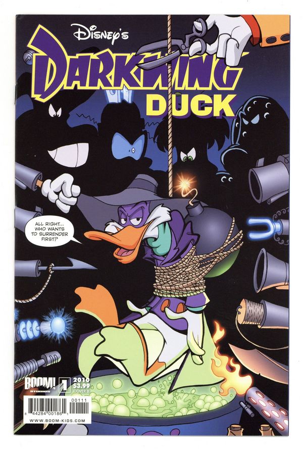 Tags: Disney Ducks & MicePublished Jun 2010 by Boom Studios.$28.00Cover by James Silvani. Written by Ian Brill. Art by James Silvani. You demanded it. And BOOM! Studios delivers. Don't miss the long-awaited, much requested return of your favorite, Darkwing Duck. Once St. Canard's greatest protector, Darkwing Duck was known the world over as 'The Terror That Flaps In The Night.' Now, mysteriously, DW has not been seen or heard from in well over a year - and St. Canard finds that evil is once again on the rise. But when a nefarious plan threatens everyone, Darkwing Duck knows it's time for the Duck Knight to return! 'Let's Get Dangerous!' with Disney and BOOM! Studios as one of Disney's most beloved characters makes a comeback in his own not-to-be-missed original mini-series! Note: Available in the United States and Canada only. Cover price $3.99.