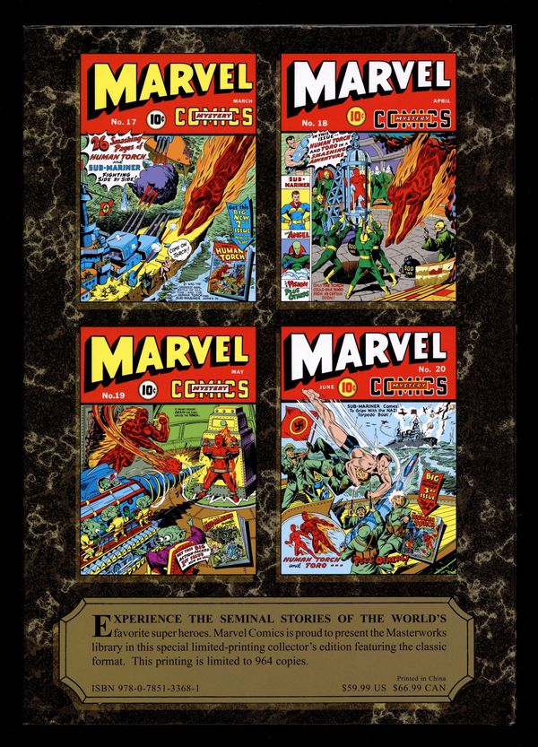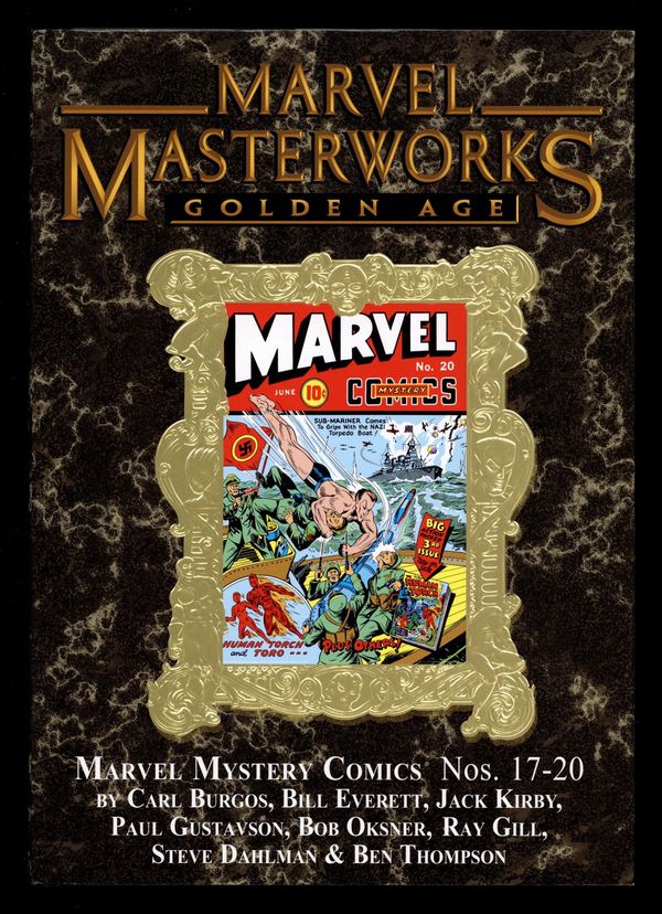 Volume 149 - 1st printing. "Golden Age Marvel Comics!" Collects Marvel Mystery Comics (1939-1949) #17-20. Written by JOE SIMON, RAY GILL, and ANDREW MCWHINEY. Art by CARL BURGOS, BILL EVERETT, JACK KIRBY, PAUL GUSTAVSON, STEVE DAHLMAN, BOB OKSNER and BEN THOMPSON. Cover by ALEX SCHOMBURG. The greatest comic magazine of the Golden Age returns with the Marvel Masterworks! Headlining the heavy-hitters of the Timely era, Marvel Mystery Comics has it all-from top-of-the-field super hero action to bizarre mystery, otherworldly noir, jungle adventure and boy detectives! And it all starts off with the history-making Human Torch/Sub-Mariner team-up by the titanic talents Carl Burgos and Bill Everett! Then the Human Torch's sidekick Toro, the Flaming Kid, makes his Marvel Mystery debut. Prince Namor, the Sub-Mariner, takes his uniquely anarchic brand of action straight to the Nazis' noses, while the Angel's origin is revealed and he begins a multi-part crusade against the sexy villainess, the Cat's Paw. Rounded out by Jack Kirby's eerie agent of vengeance, the Vision; the wonderfully weird Electro; Terry Vance, School Boy Sleuth; and the adventures of Ka-Zar, it's the classic package that made Marvel famous! Hardcover, 280 pages, full color. Cover price $59.99.