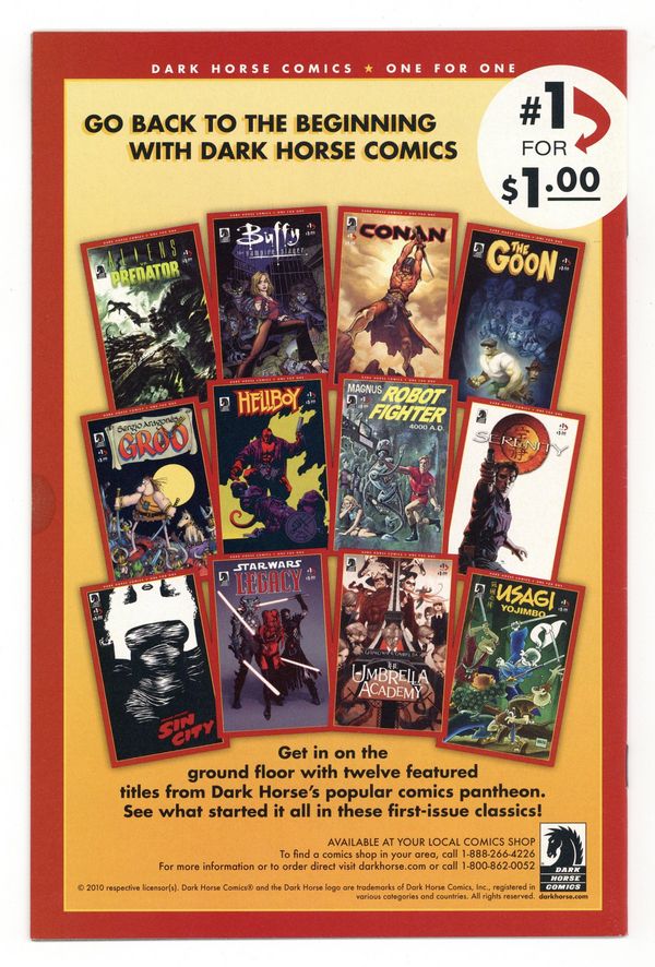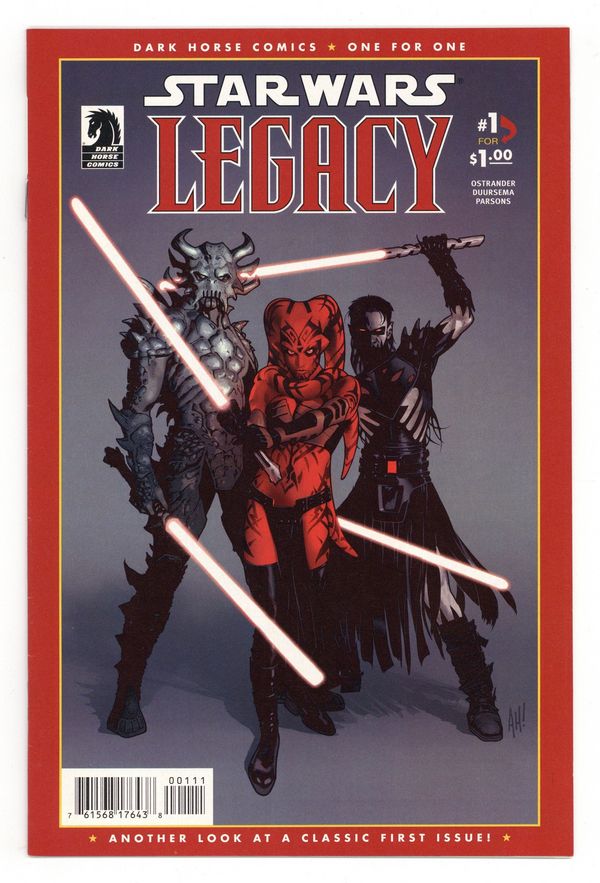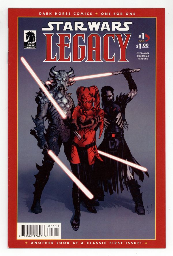 Tags: Star WarsPublished Sep 2010 by Dark Horse.$36.001 for $1: Star Wars Legacy John Ostrander (W), Jan Duursema (P), Dan Parsons (I), and Brad Anderson (C) On sale Sept 1 FC, 28 pages $1.00 The Jedi Temple is attacked, an Emperor is betrayed, and the Sith are born anew! A lot can happen in a hundred years, but all of the above happens just in this first issue! Not since Luke Skywalker first stepped aboard the Millennium Falcon has the galaxy seemed like such a vast, exciting, dangerous place! Cover price $1.00.