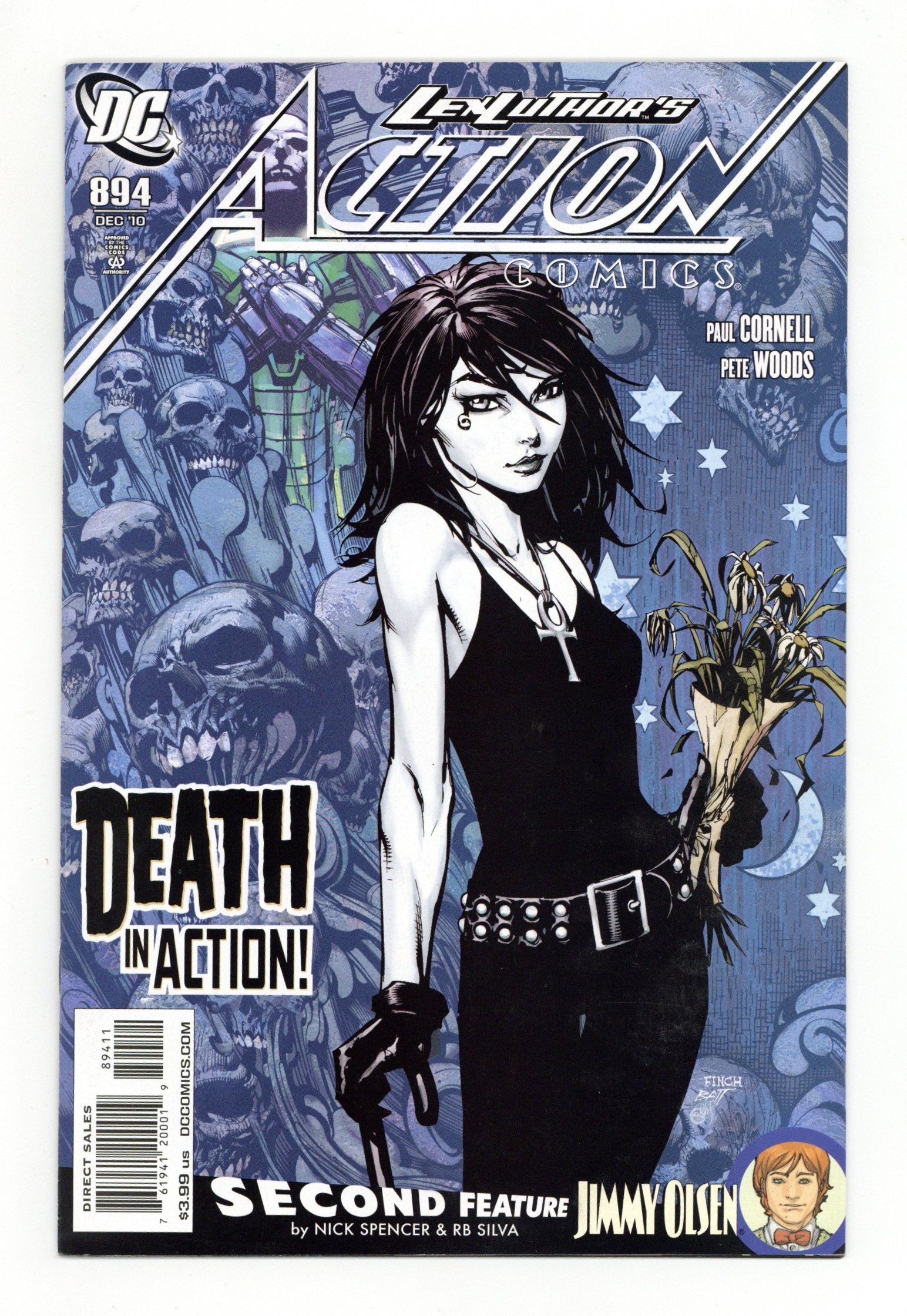Direct Edition. Cover by David Finch and Matt Banning. Blackest Night Aftermath - The Black Ring: Part 5 - Written by PAUL CORNELL Co-feature written by NICK SPENCER Art by PETE WOODS Co-feature art by RB SILVA & DENIS FRIETAS Guest-starring Death from SANDMAN! Yes, you read that right! Death! From SANDMAN! In ACTION COMICS! Lex Luthor finds himself literally at Death's door, which leads to a fascinating look not only into the mind of one of the all-time greatest villains, but also at what Death means in the DC Universe... And in the JIMMY OLSEN co-feature, an alien race has chosen Metropolis to be the host of their millennial celebration! And who better to show them around town than James Bartholomew Olsen? But when the alien princess gets wasted and her brother starts picking bar fights, it's up to Jimmy to get things under control before all of Metropolis is destroyed! 44 Pages, Full Color. Cover price $3.99.