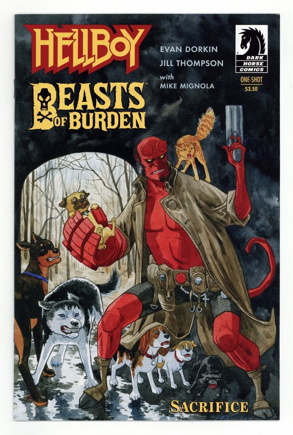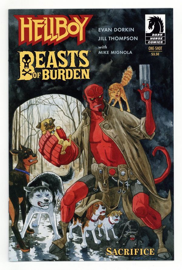 Published Oct 2010 by Dark Horse.$15.00Cover by Jill Thompson. Mike Mignola's Hellboy joins the animals' of Burden Hill! HELLBOY/BEASTS OF BURDEN Mike Mignola (W), Evan Dorkin (W), and Jill Thompson (A) On sale Oct 27 FC, 32 pages $3.50 One-shot The paranormal activity in the outwardly charming town of Burden Hill has gone from bad to worse, as seen in Dorkin and Thompson's hardcover graphic novel Beasts of Burden: Animal Rites. Now the occult-investigating team of dogs (and one cat) need some serious help. Contact with the Wise Dog Society has broken off, leaving the team on its own, as a series of unexplained animal slayings have begun to occur. But magic can work in surprising ways, and help is brought to the team with the unexpected arrival of the World's Greatest Paranormal Detective. Evan Dorkin (Milk and Cheese, Bizarro World) and Jill Thompson (Scary Godmother, Magic Trixie) join forces with Mike Mignola (Hellboy, B.P.R.D., Witchfinder, Baltimore) in an amazing one-shot bringing their supernatural worlds together! Cover price $3.50.