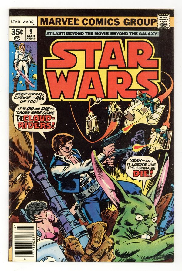 Tags: Pizzazz Variant, Star Wars$12.00Pizzazz Variant, has centerfold subscription offer for "Pizzazz" Magazine. "Showdown on the Wasteland World!" Written by Roy Thomas. Art by Howard Chaykin and Tom Palmer. Han Solo, Chewbacca, and their group of misfit heroes battle the Cloud-Riders for the fate of a world. Meanwhile, Luke Skywalker continues his desperate search for a new location for the Rebel's base of operation. Includes a pin-up of Han, Chewie, Luke, and Leia by Howard Chaykin. Cover price $0.35.