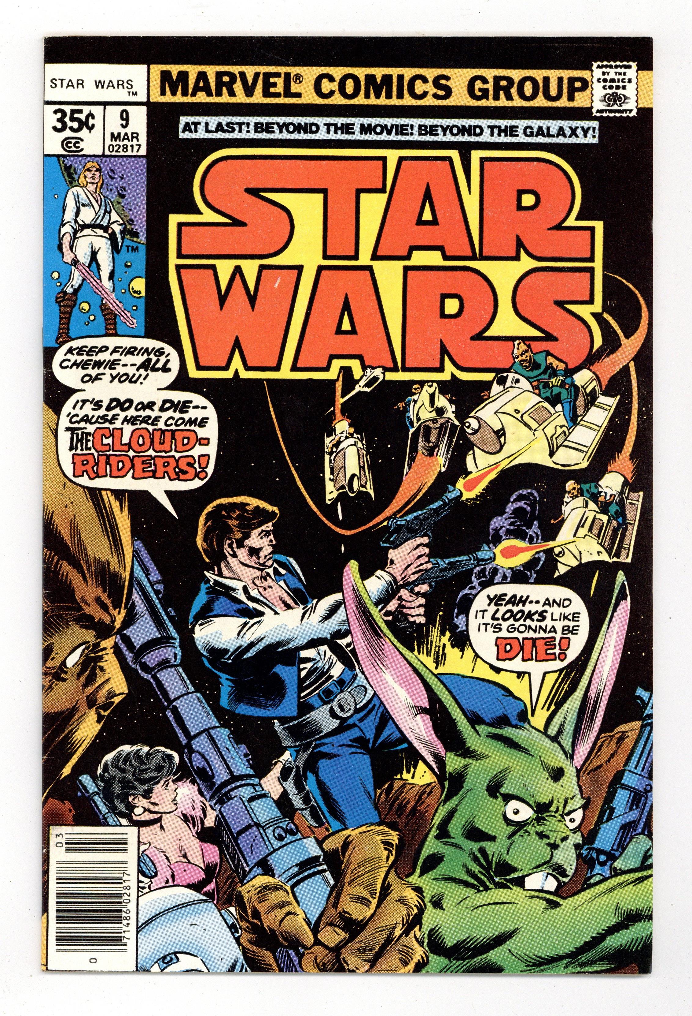 Tags: Pizzazz Variant, Star Wars$14.00Pizzazz Variant, has centerfold subscription offer for "Pizzazz" Magazine. "Showdown on the Wasteland World!" Written by Roy Thomas. Art by Howard Chaykin and Tom Palmer. Han Solo, Chewbacca, and their group of misfit heroes battle the Cloud-Riders for the fate of a world. Meanwhile, Luke Skywalker continues his desperate search for a new location for the Rebel's base of operation. Includes a pin-up of Han, Chewie, Luke, and Leia by Howard Chaykin. Cover price $0.35.