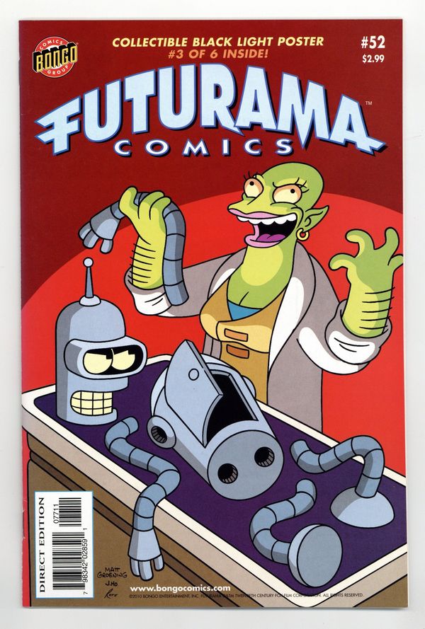 $45.00Includes foldout poster inserted in the center! (W) Rogers, Delaney (A) Kazaleh, Davis Looking to put the shine back in his shiniest body part, Bender undergoes a series of robotic enhancements. However, one 'nip' here and one 'tuck' there prove not to be enough for the rejuvenated robot, and before long he is on a path to destruction. Also, Zapp Brannigan shows his mettle and earns a medal. Plus, this issue features the third of six awesome Futurama posters, suitable for unfolding! Cover price $2.99.