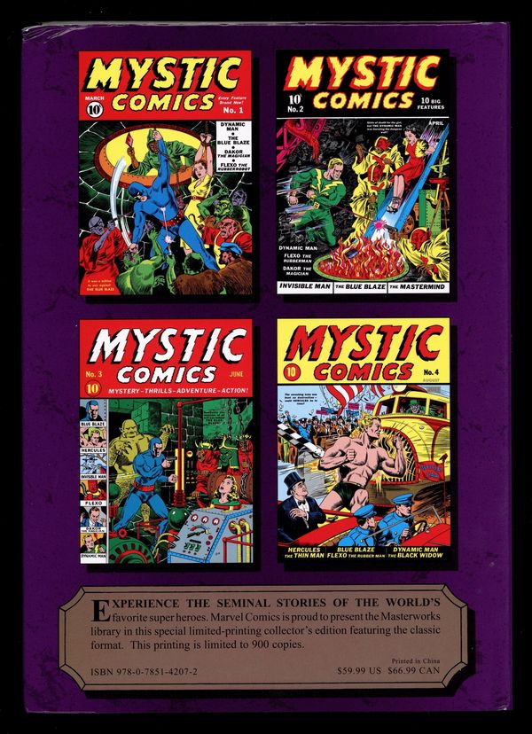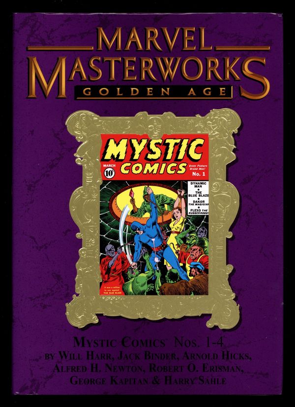 Volume 154 - 1st printing. "Golden Age Mystic Comics!" Collects Mystic Comics (1940-1942 1st Series) #1-4. Cover by ALEX SCHOMBURG. Hot on the heels of the smash comic book hit of 1939, Marvel Comics, publisher Martin Goodman called up two companion titles to join his emerging comics line, post-haste. And now, for the first time in 70 years, the Marvel Masterworks bring the last of that trio of titles-Mystic Comics! Chock full of pulp-style men of action, hard-boiled gumshoes, mythical strongmen, undead avengers, and-of course-super heroes, Mystic Comics is a roller-coaster thrill ride back to the earliest days of comic books, when freewheeling writers and artists threw out wild ideas to a public with an insatiable appetite for comics. In this fully restored collection you'll encounter comics first super-stretching hero-Flexo the Rubber Robot; the hero from beyond the grave-the Blue Blaze; the Dynamic Man, Master Mind Excello, the invisible Dr. Gade, Dakor the Magician, Zara of the Jungle, the Space Rangers, Hercules, the devil-possessed Black Widow, and more! Featuring an in-depth introduction by noted comics and pulp historian Will Murray, this volume is a priceless adventure into the Golden Age of comics! Hardcover, 272 pages, full color. Cover price $59.99.