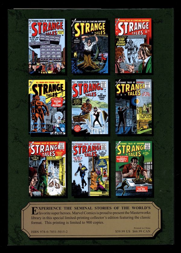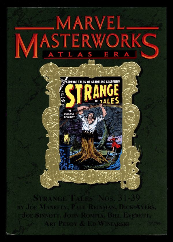 Volume 156 - 1st printing. "Atlas Era: Strange Tales: Book 4!" Collects Strange Tales (1951-1976 1st Series) #31-39. Cover by HARRY ANDERSON. From the heart of the 1950s comes another dose of horrific monsters, unhinged lunatics, rampaging robots, and outer space invaders-the hallmarks of the explosive Atlas Era! Yes, it's a new batch of classics from the time when your comics kept you up at night. Chock full of stories-most never before reprinted-that run the spectrum of twists, surprises and shocks, Marvel Masterworks: Atlas Era Strange Tales features a host of artistic talent rarely seen a single series! So prepare yourself for just a few of the shocks they have in store for you: Werner Roth will find out whether or not you're made of "Flesh and Blood." Joe Sinnot sets off the "Danger Signal." Like it or not, Paul Reinman will discover whether you're "Man or Beast." John Romita sets his sights on "The Target." And Bill Everett reveals "Karnoff's Plan." Marvel Masterworks: Atlas Era Strange Tales is a dark trip into the wry and subversive heyday of horror comics that pushed comics hysteria to the breaking point. So why don't you see what all the hubbub was about and come join us for a scare? Hardcover, 248 pages, full color. Cover price $59.99.
