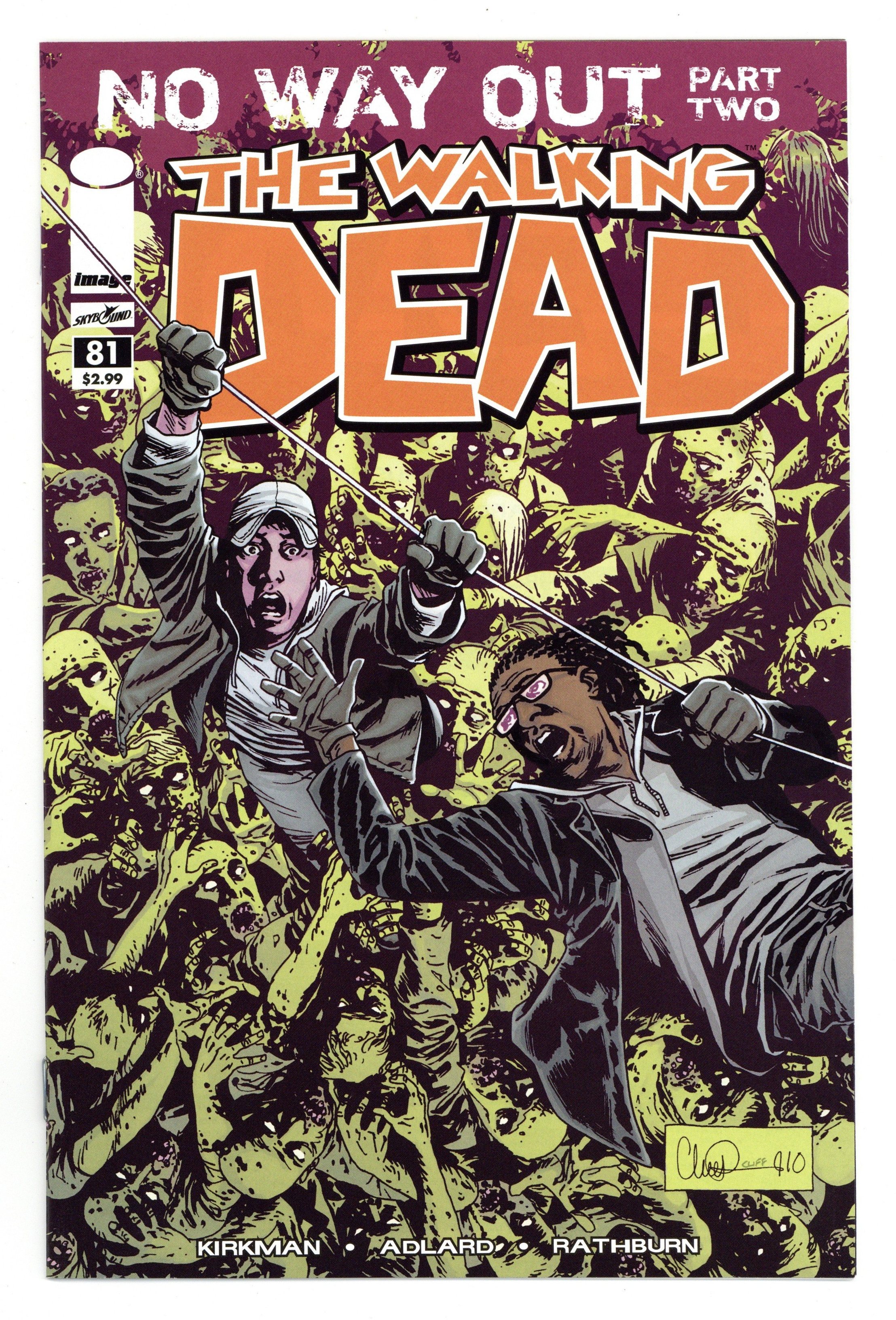 $23.00NO WAY OUT: Part 2 of 5 - Written by Robert Kirkman. Art and Cover by Charlie Adlard and Cliff Rathburn. 'NO WAY OUT' continues. Desperate times call for desperate measures. Newsflash: Throughout 2011, THE WALKING DEAD will be reprinted in single issue form and shipping weekly (see Walking Dead Weekly (2011 Image) Reprint Series)! It's the perfect opportunity to get in on the ground floor of the series that inspired the hit AMC television series! 28 pages, B&W (gray tones). RETAILER WARNING: MAY NOT BE SUITABLE FOR ALL AGES Cover price $2.99.
