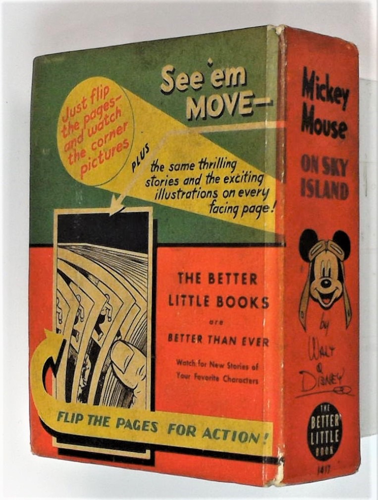 Mickey Mouse on Sky Island (1941 Whitman BLB) #1417, flip pictures, Gottfredson, considered by Gottfredson to be his best Mickey story. 3.5" x 4.5", 432 pages, B&W.