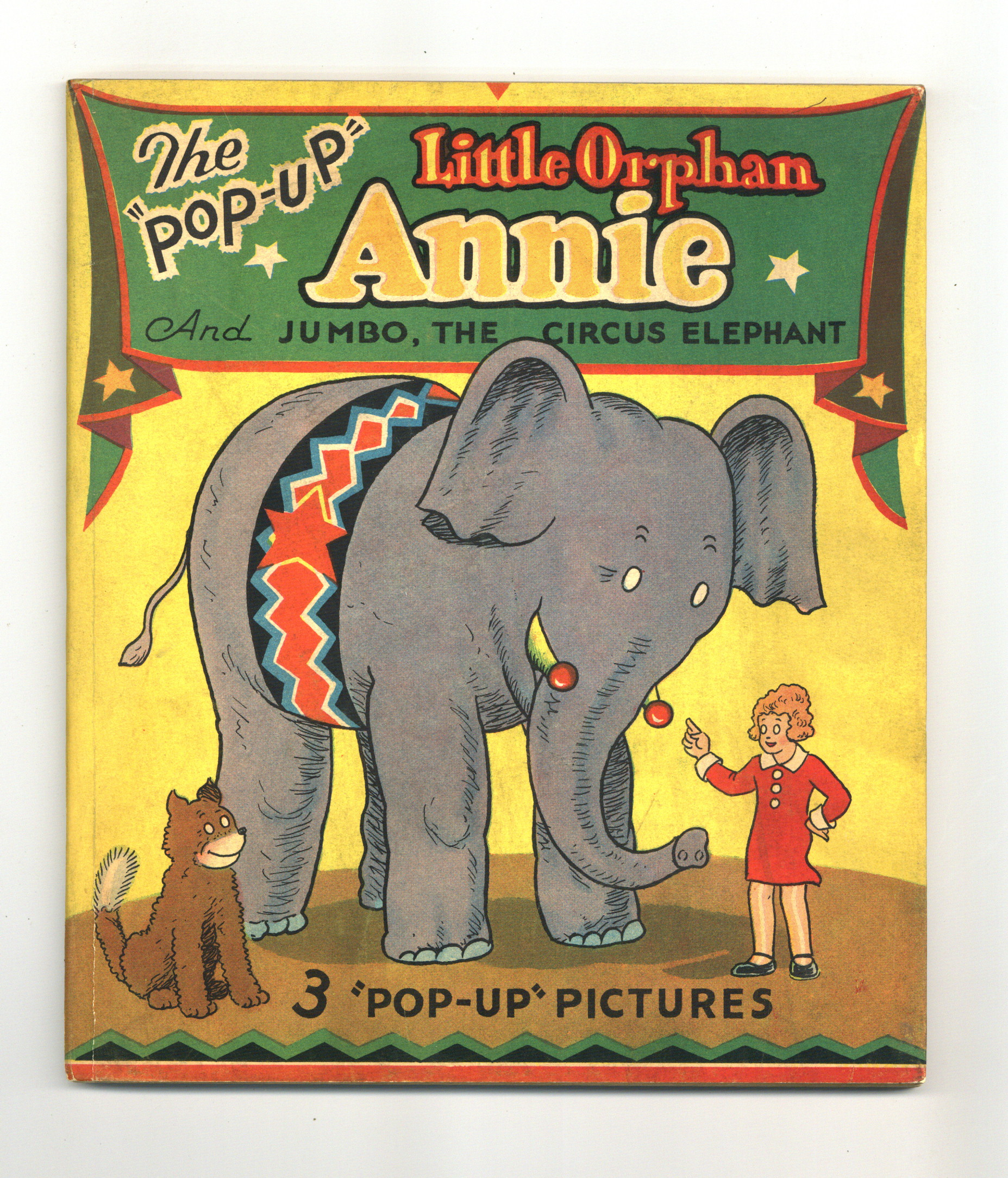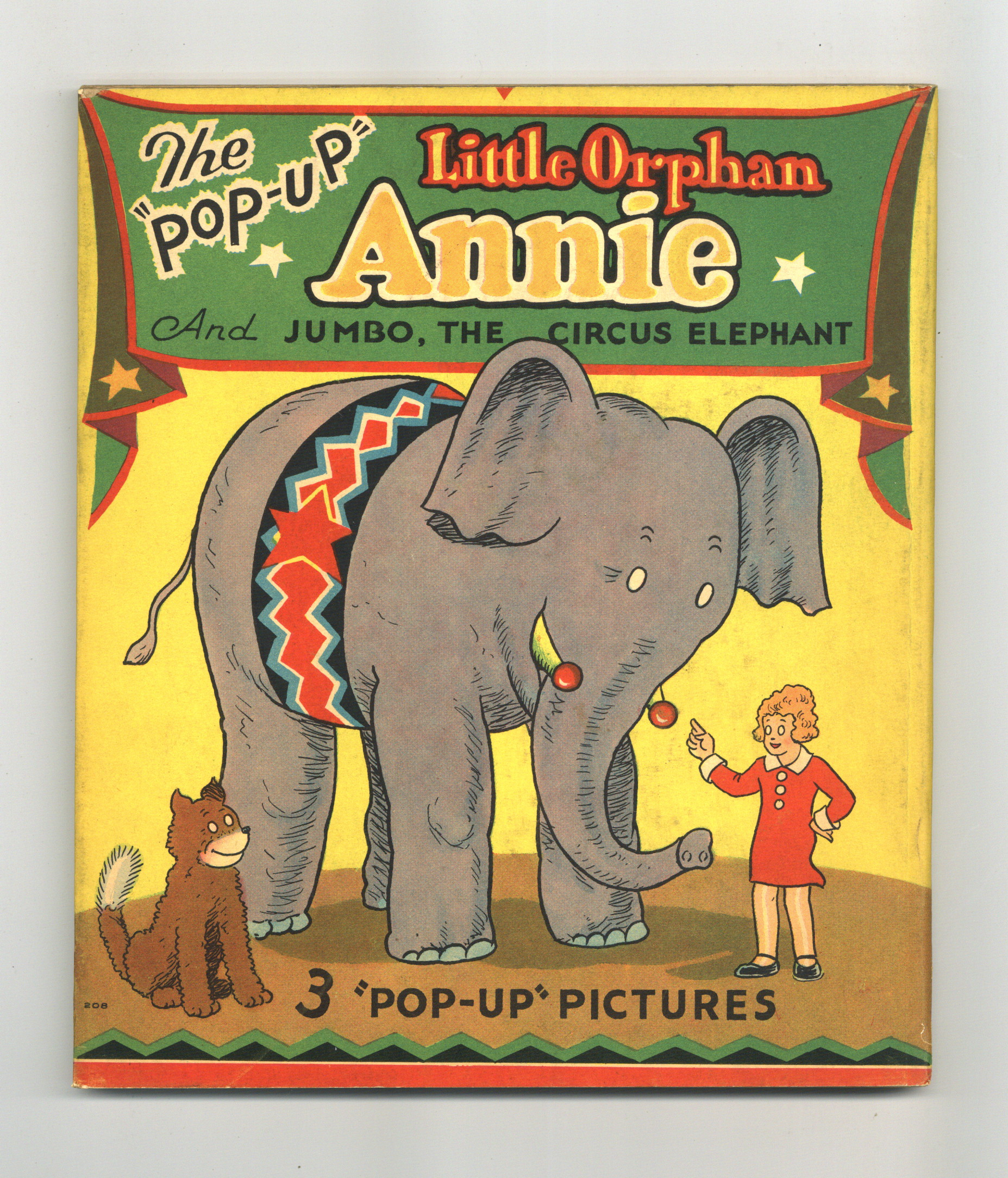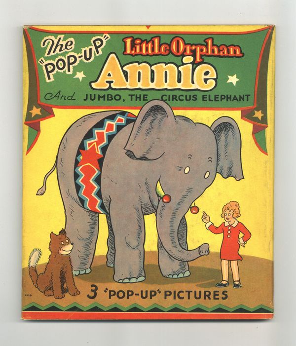 Published 1935 by Blue Ribbon Press.$178.00Pop-Up Little Orphan Annie and Jumbo the Circus Elephant (1935 BRP BLB) #208, 8" x 9 1/2", 3 Pop-Ups, hardcover, H. Gray