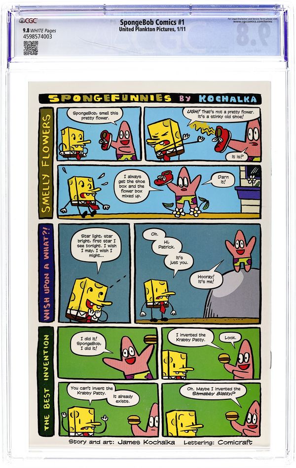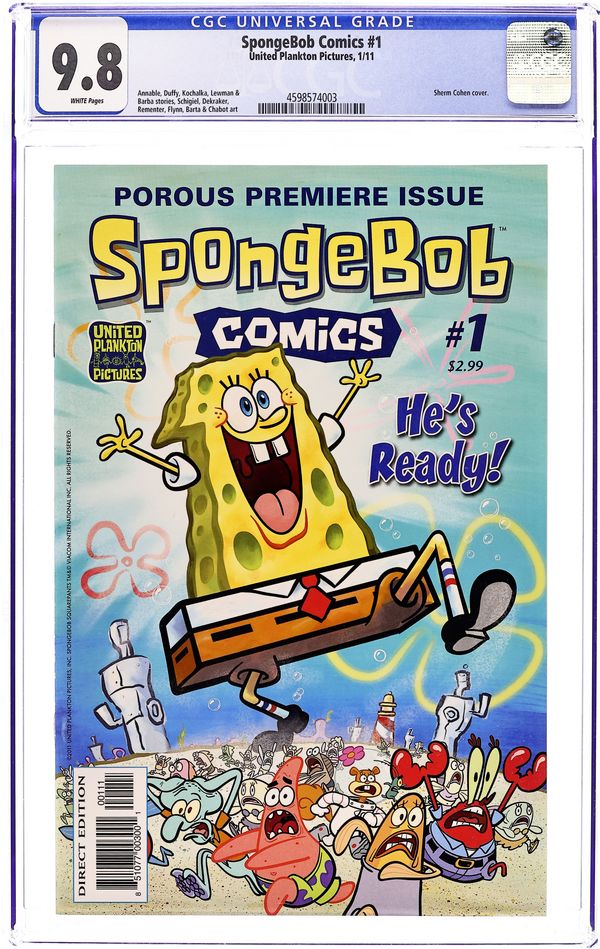 Direct Edition. (W/A) Kochalka, Barta, Sikoryak, Various Are you ready for the comic book premiere of the world's most popular fry-cooking sponge?! This first issue is a whale of a collection of comics by talented indy, mainstream, and animation cartoonists - James Kochalka (Johnny Boo, American Elf), Hilary Barta (Fear Agent), Graham Annable (Grickle), Gregg Schigiel (X-Babies), Jacob Chabot (Mighty Skullboy Army, X-Babies), and more! In this issue: SpongeBob has a recurring nightmare about his favorite cereal; Squidward introduces music to the Krusty Krab; and Mermaid Man is freaked out by a fan who won't... stop... staring! Also: Patrick and SpongeBob team up for the most idiotic joke ever; SpongeBob learns to glow; and readers are invited to draw the absorbing one's new hairdo! All this, plus a page of SpongeFunnies by James Kochalka and a cover pinup, equals a ship-shape maiden voyage! Cover price $2.99.