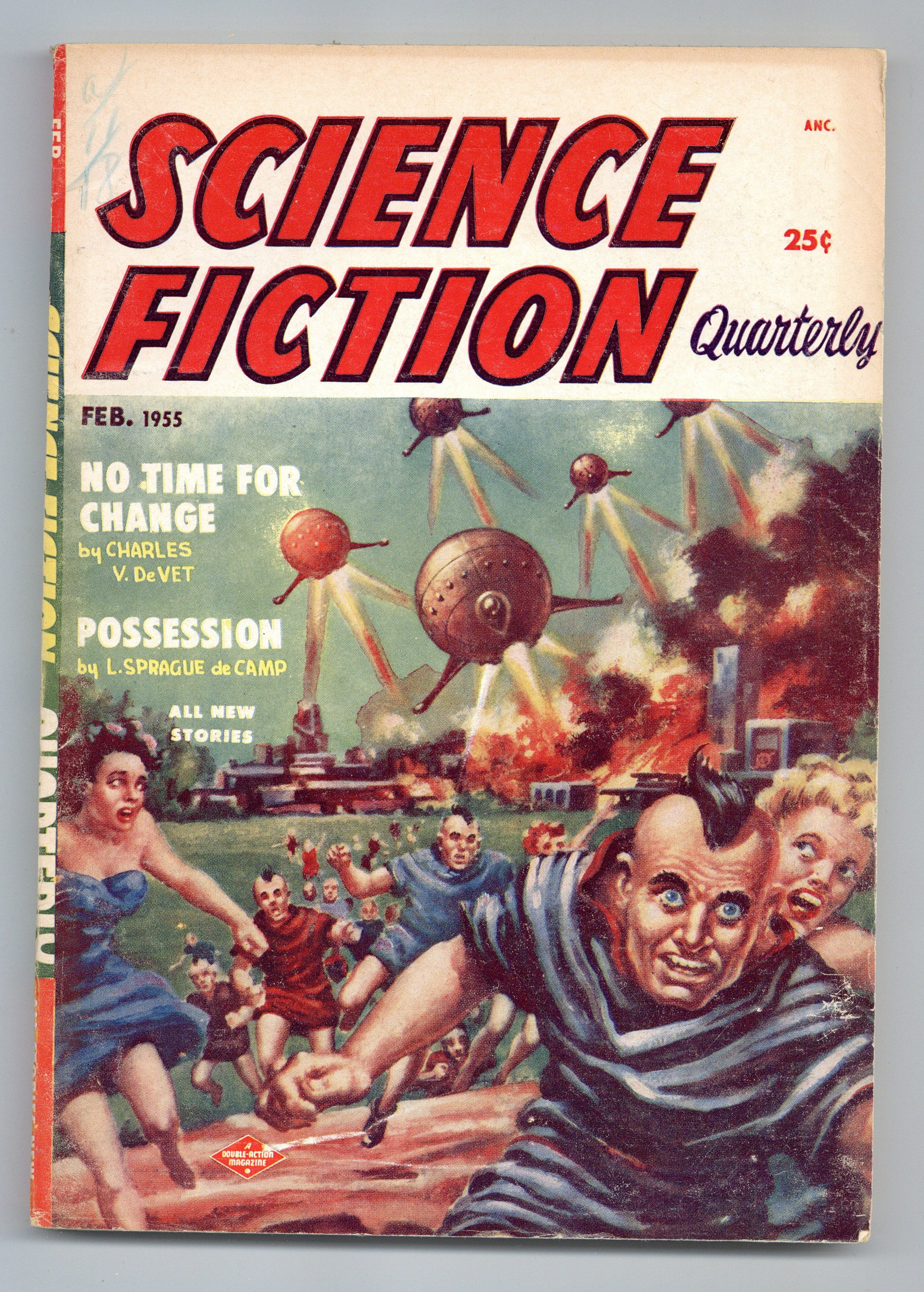 Volume 3, Issue 4 - February, 1955. Science fiction stories: "Possession" (by L. Sprague de Camp), "Giant in the Forest" (Frank Belknap Long), "The Adventurers" (C.M. Kornbluth), and "No Time For Change" (Charles V. De Vet). Book reviews by Damon Knight. Cover by Frank Kelly Freas. Interior illustrations by Freas, Hulsey, and Milton Luros. 6-5/8 in. x 9-1/8 in.; black and white; 98 newsprint pages. Cover price $0.25.