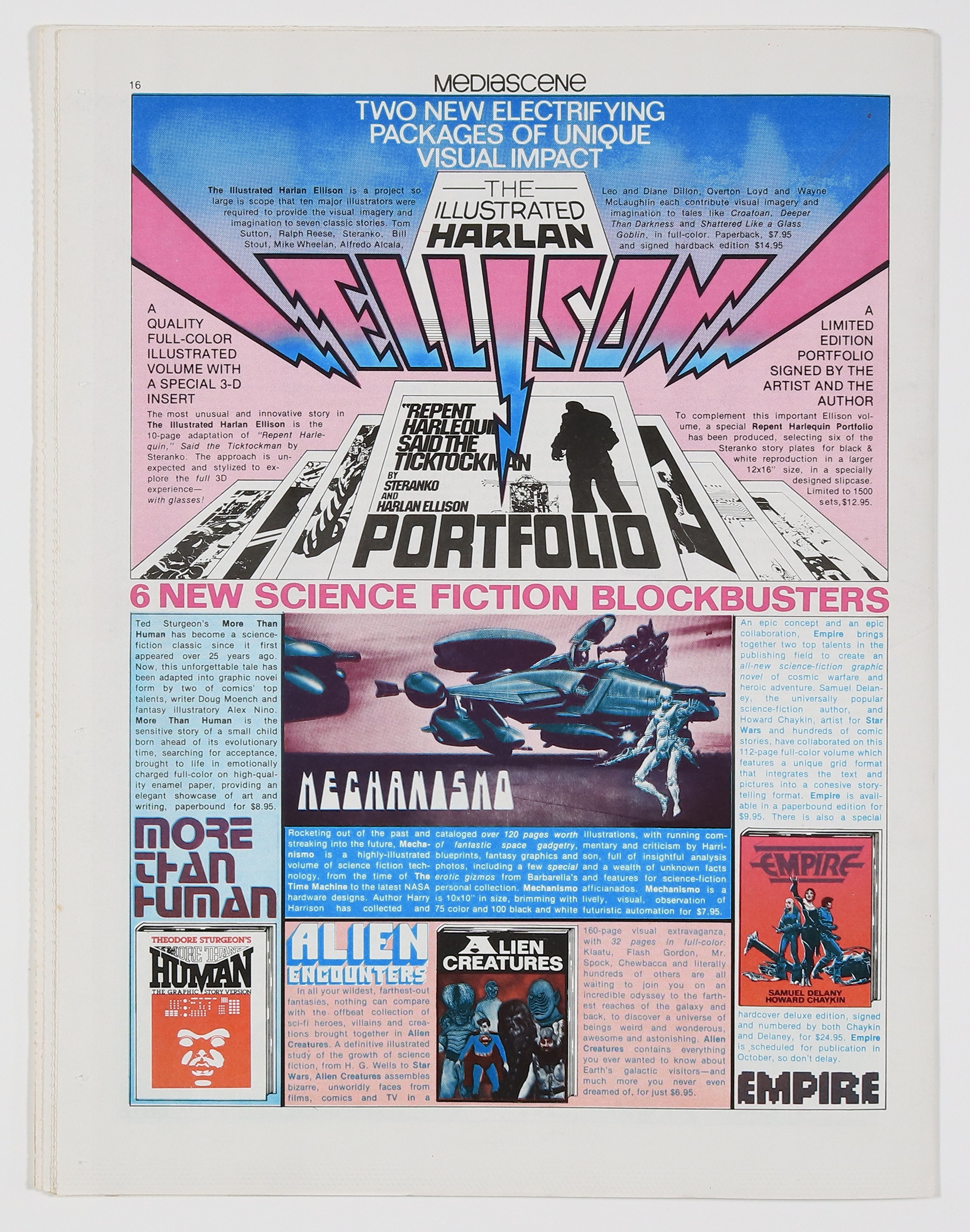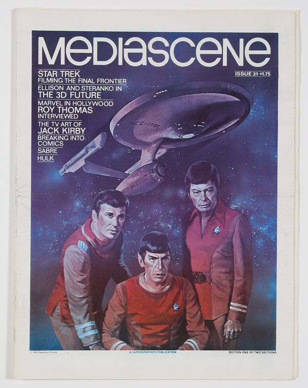 Published Jun 1978 by Supergraphics.$65.00Star Trek movie, Harlan Ellison, Jim Steranko, Roy Thomas interview, the TV art of Jack Kirby, Hulk centerspread by Dan Adkins, and more. Tabloid newspaper format in two sections; partial color; 36 pages on good quality white paper. Cover price $1.75.