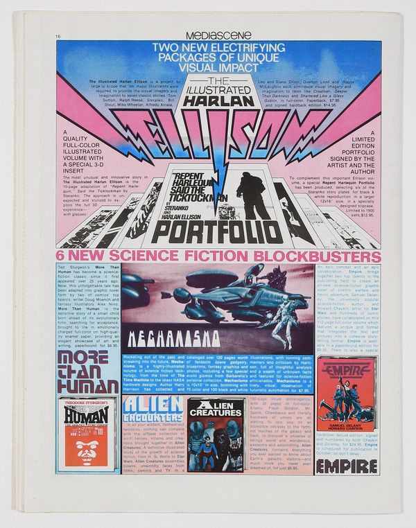 Published Jun 1978 by Supergraphics.$11.00Star Trek movie, Harlan Ellison, Jim Steranko, Roy Thomas interview, the TV art of Jack Kirby, Hulk centerspread by Dan Adkins, and more. Tabloid newspaper format in two sections; partial color; 36 pages on good quality white paper. Cover price $1.75.