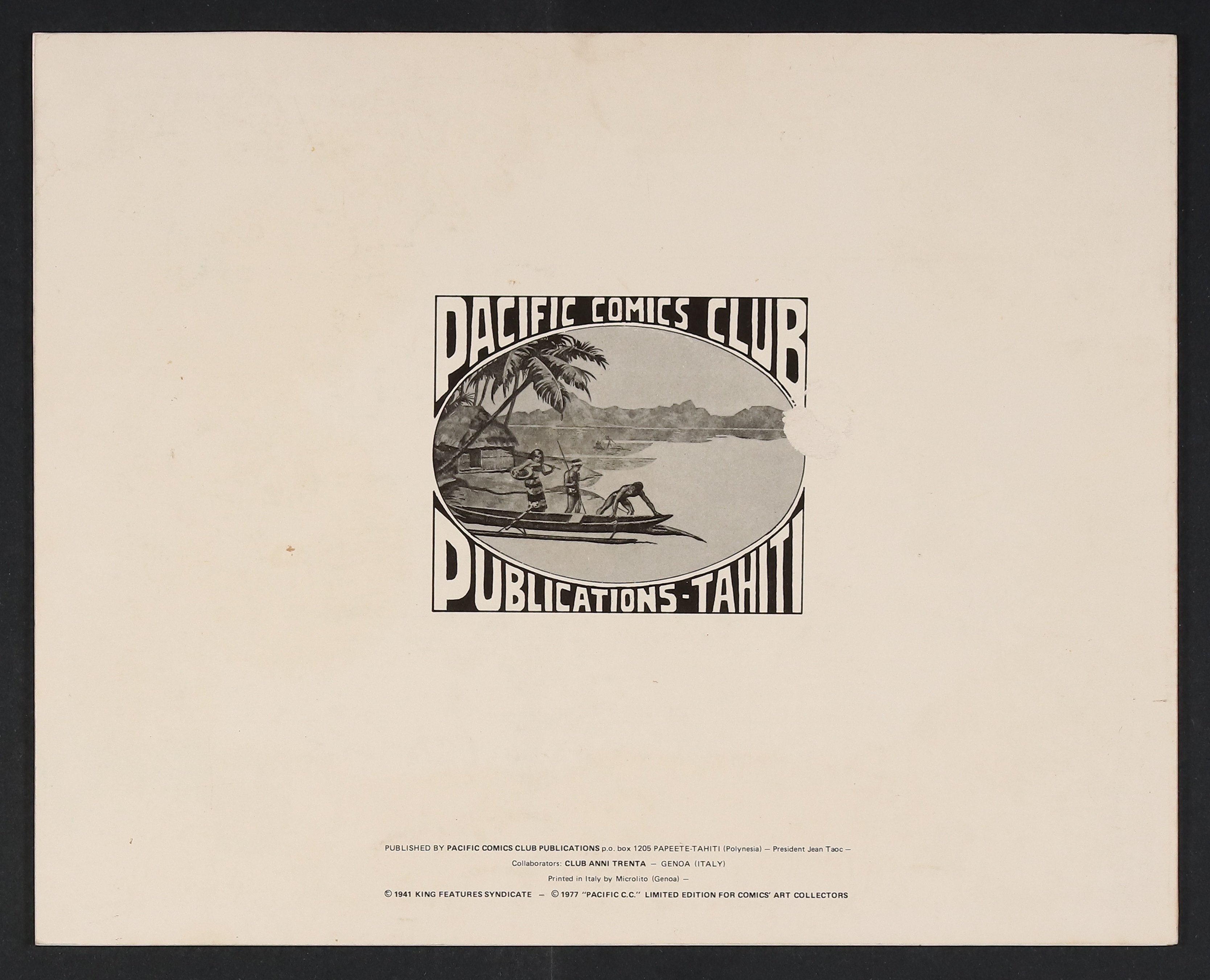 Published 1977 by Club Anni Trenta.$5.00Story, art and cover by Alex Raymond. Pacific Comics Club and Italy's Club Anni Trenta present full-color reprints of Alex Raymond's Sunday pages from 1943. While printed in Italy with an Italian translation of the title on the cover, the rest of the book is in English. Horizontal format, 15.5" x 12.5", 56 pages, full color.