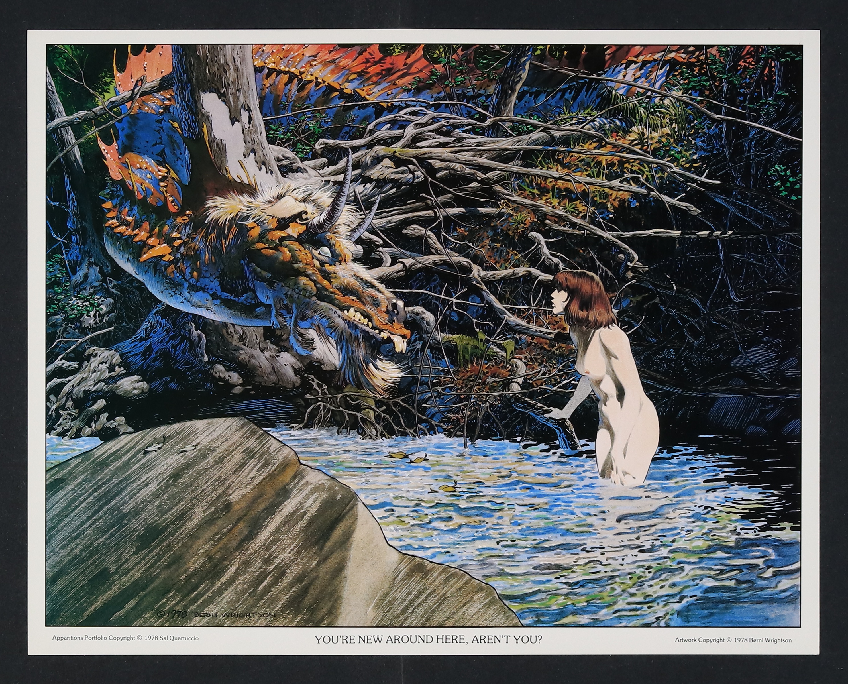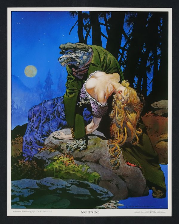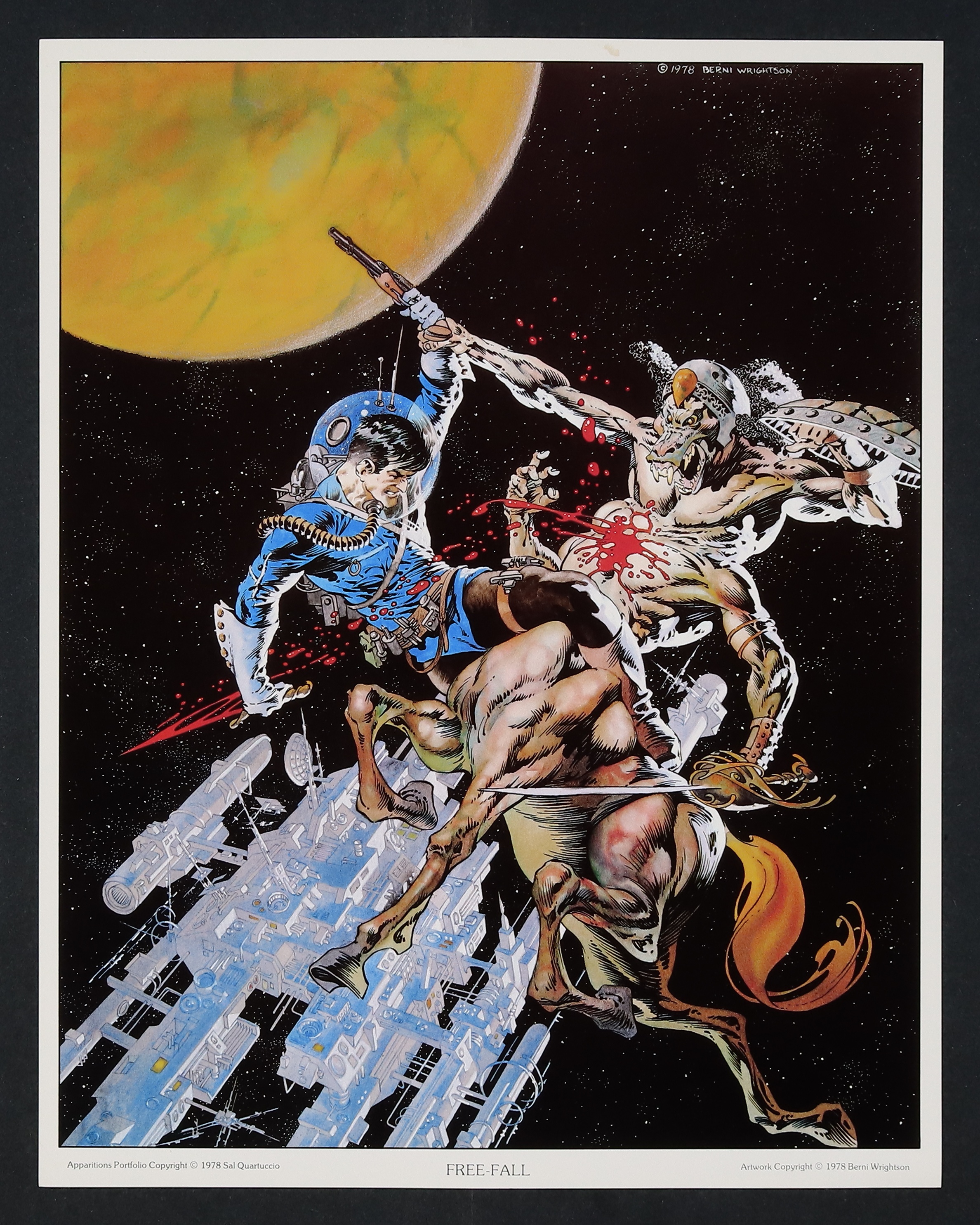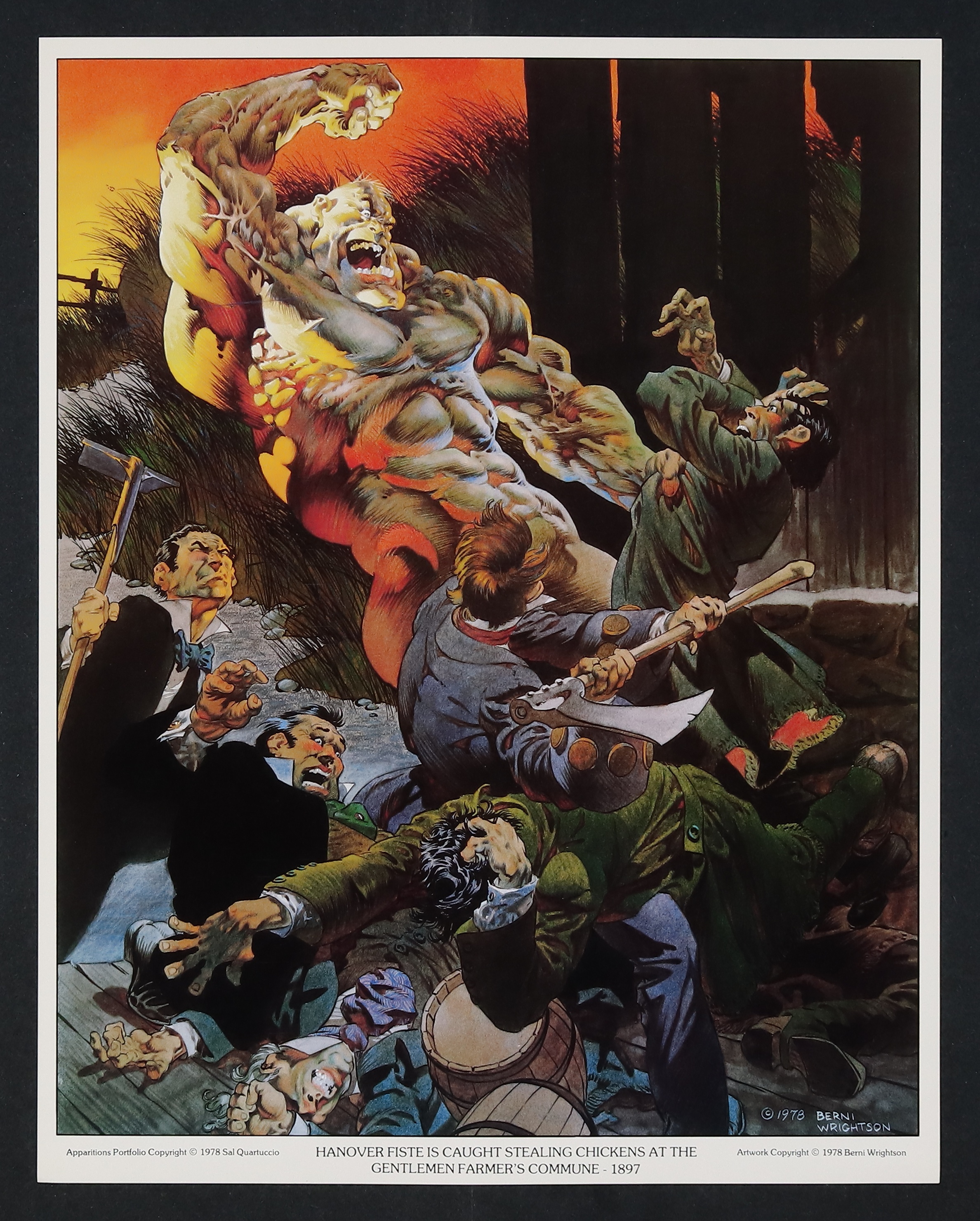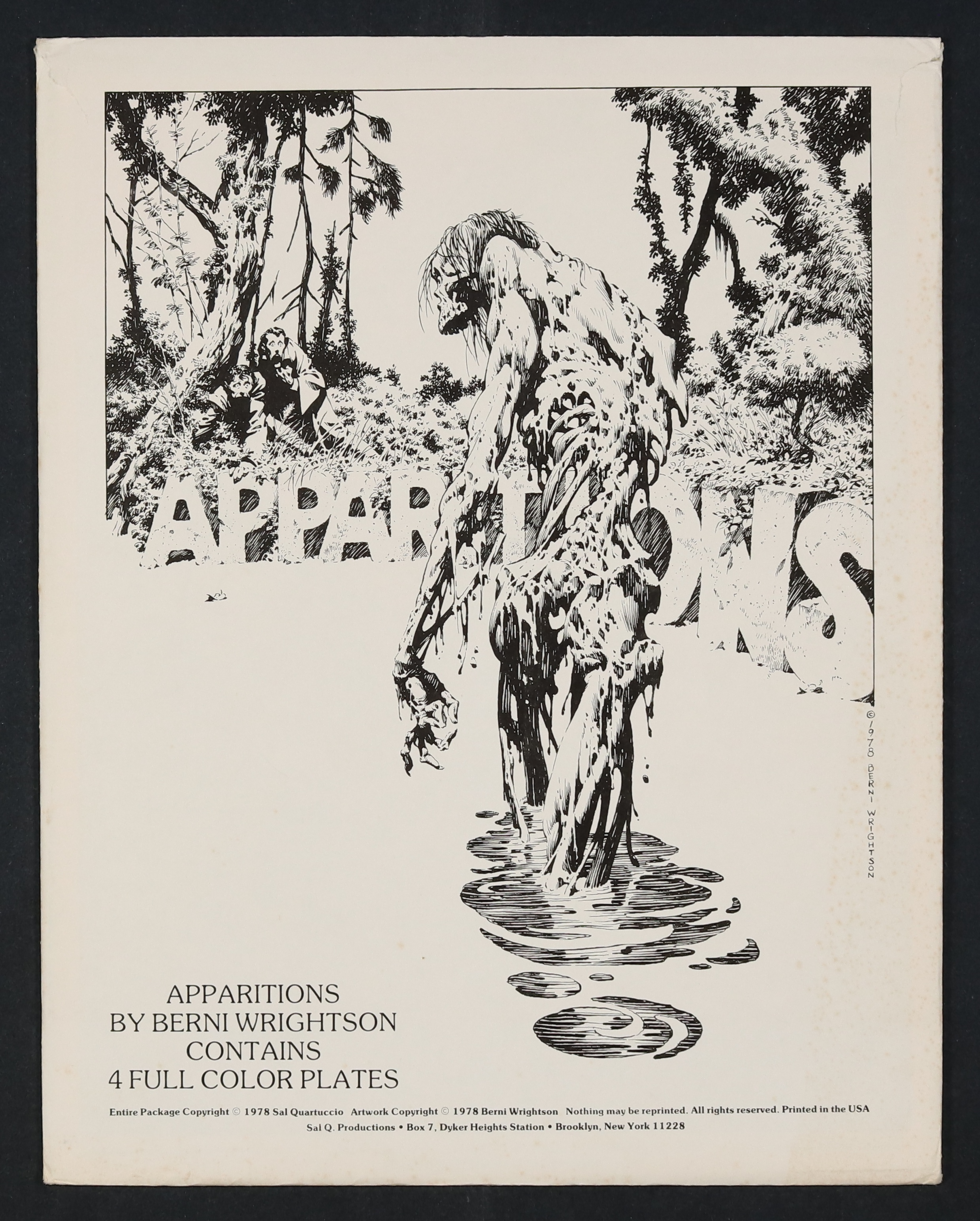 Apparitions (1978) by Bernie Wrightson, is a portfolio published by Sal Q. Productions. Includes four horrifying pictures in magnificent color. 11-in. x 14-in. on slick card stock. Illustrated black-and-white envelope.