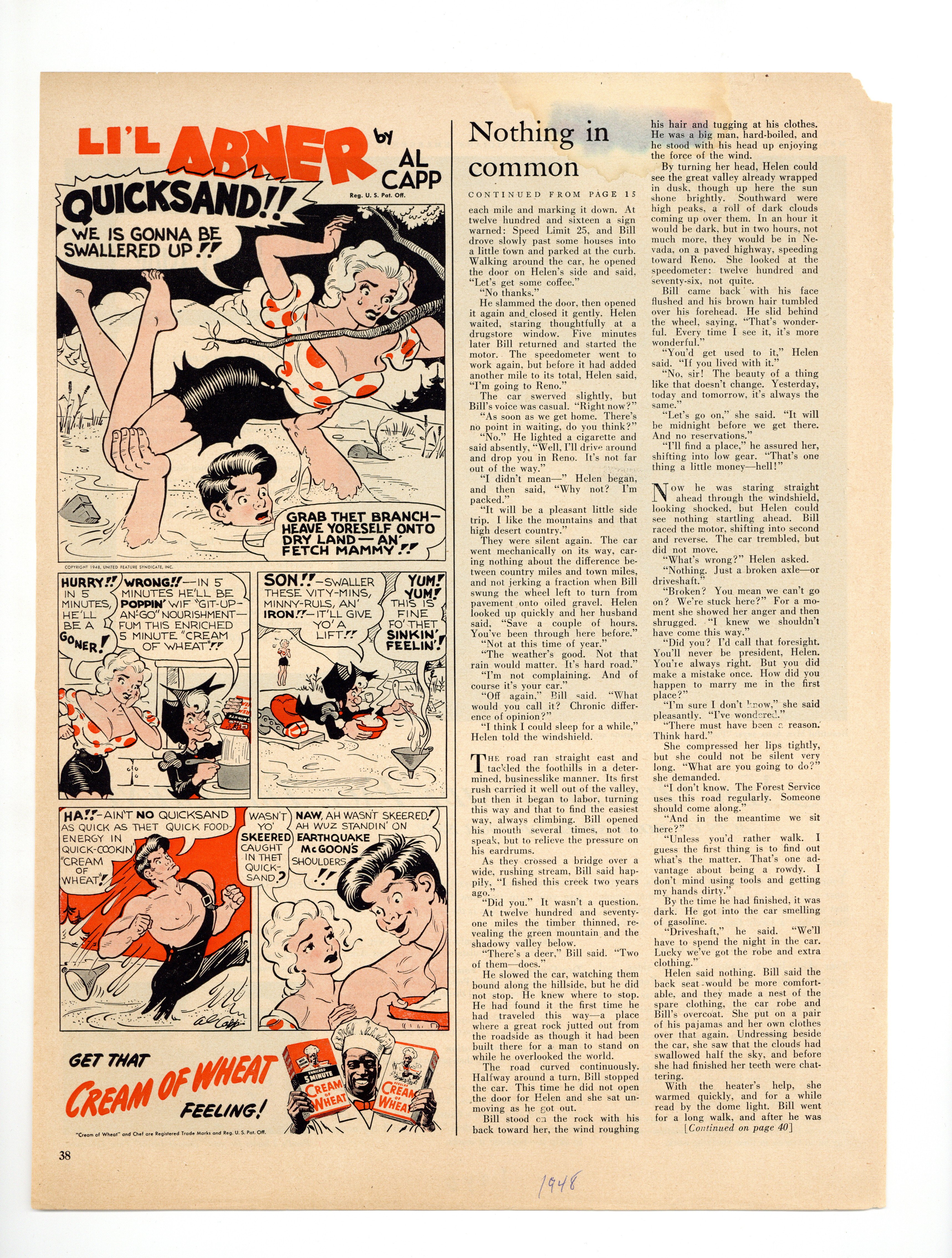 Half-page ad by Al Capp featuring Li'l Abner and the gang. Copyright 1948. Measures 5.25 in. x 14 in. or 4.75 in. x 11.5, depending upon the magazine that published the ad. Black and white plus red spot-color.