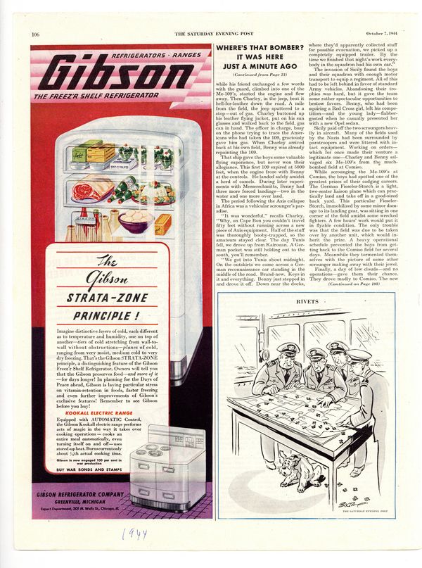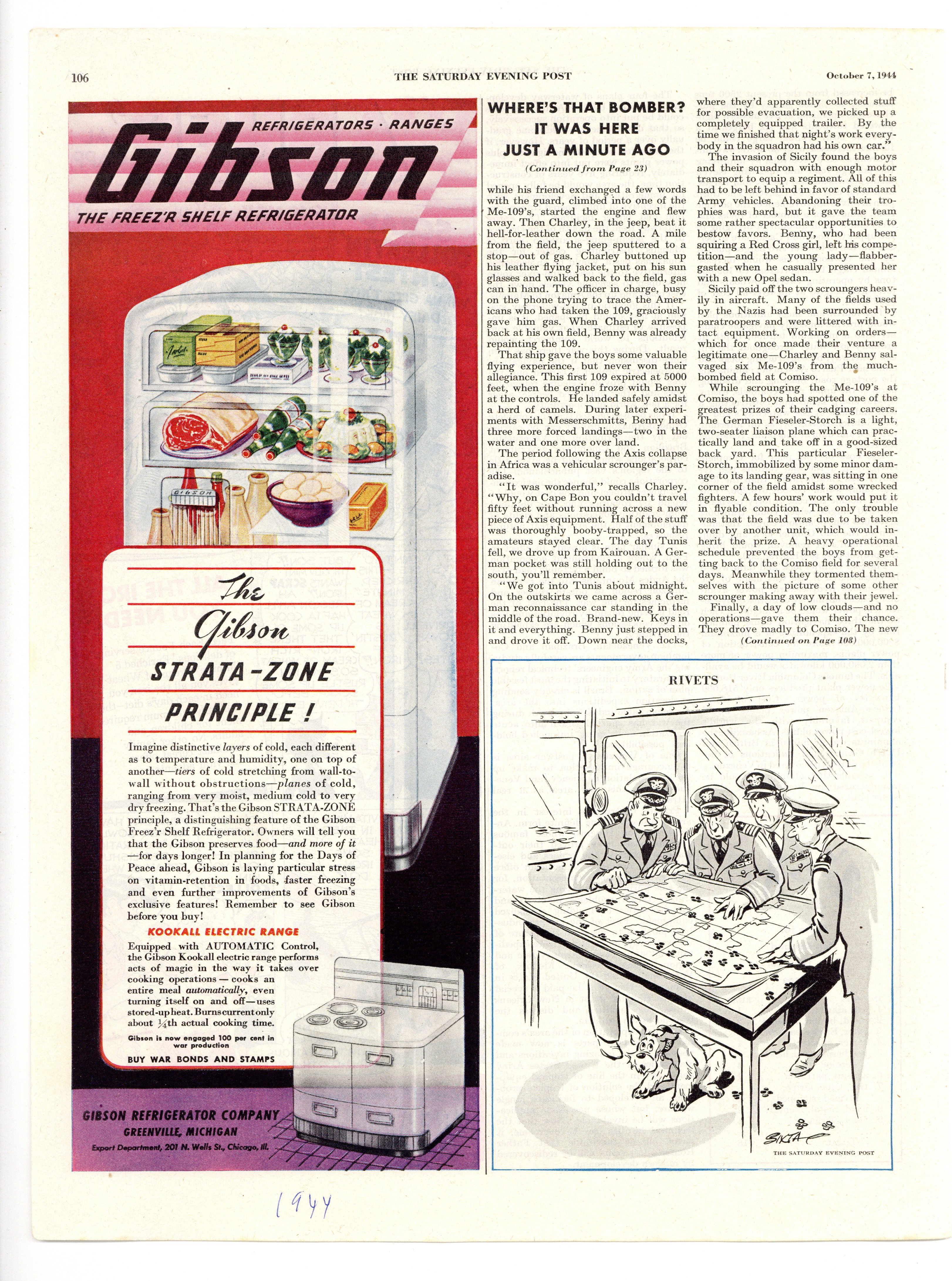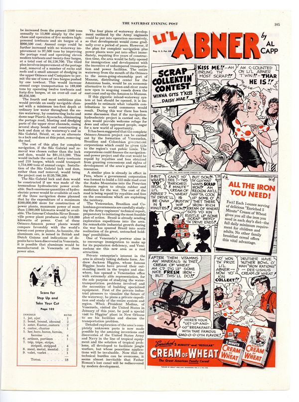 Half-page ad by Al Capp featuring Li'l Abner and the gang. Copyright 1944. Measures 5.25 in. x 14 in. or 4.75 in. x 11.5, depending upon the magazine that published the ad. Black and white plus red spot-color.